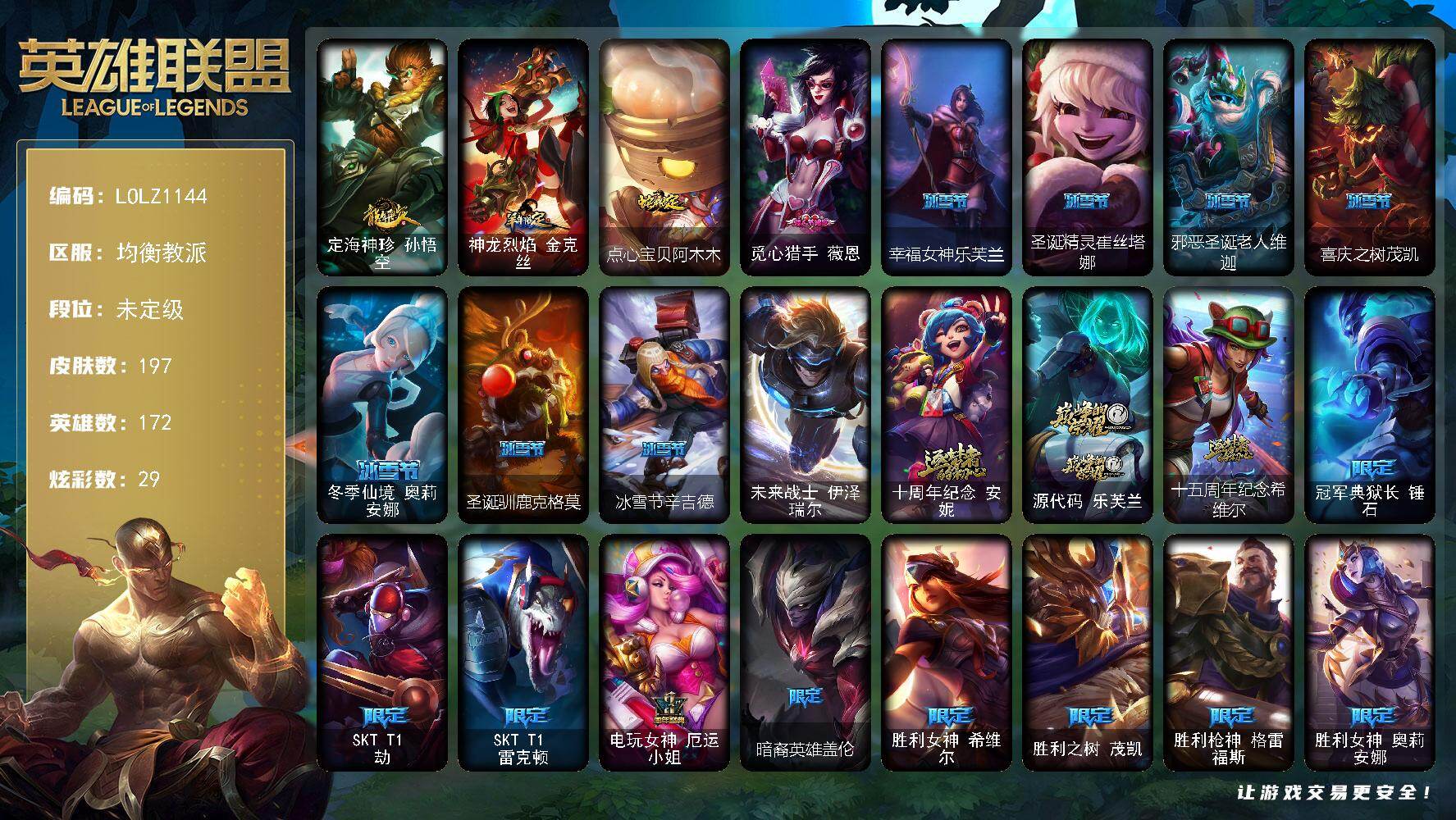 172英雄/197皮肤/1终极/3神话/32限定/7臻彩/29炫彩/17传说/47史诗/未定级/