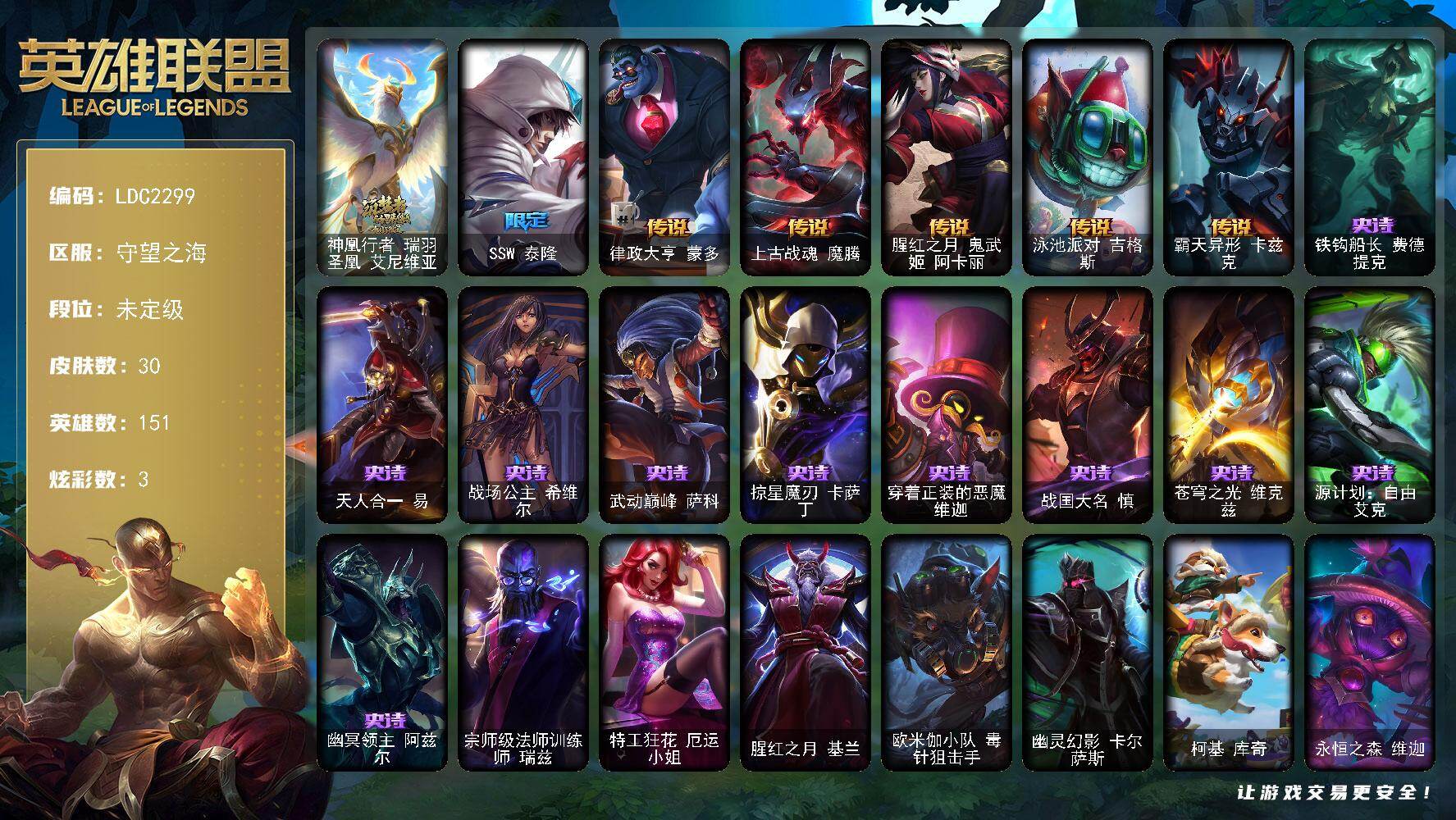 151英雄/30皮肤/1神话/1限定/1臻彩/3炫彩/5传说/10史诗/未定级/