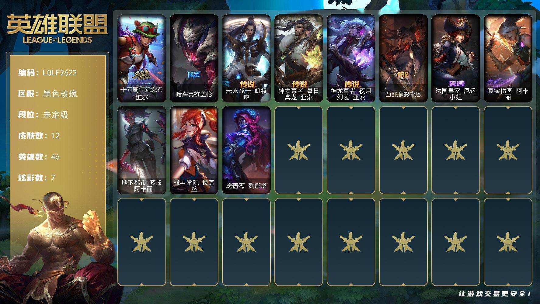 46英雄/12皮肤/1神话/2限定/6臻彩/7炫彩/4传说/1史诗/未定级/