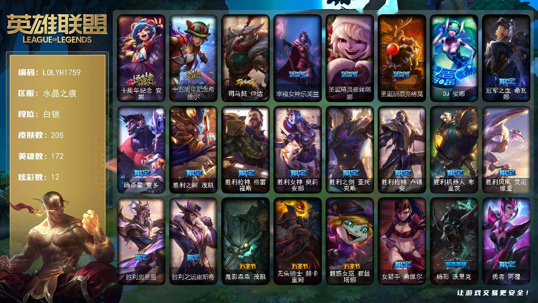 172英雄/205皮肤/1终极/2神话/23限定/1臻彩/12