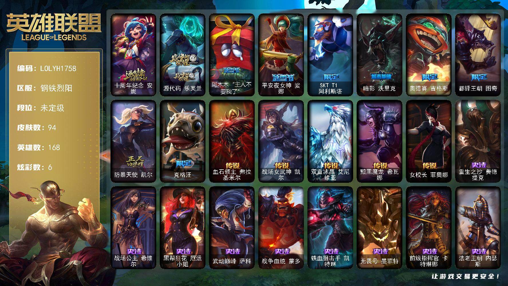 168英雄/94皮肤/2神话/8限定/6炫彩/5传说/20史诗