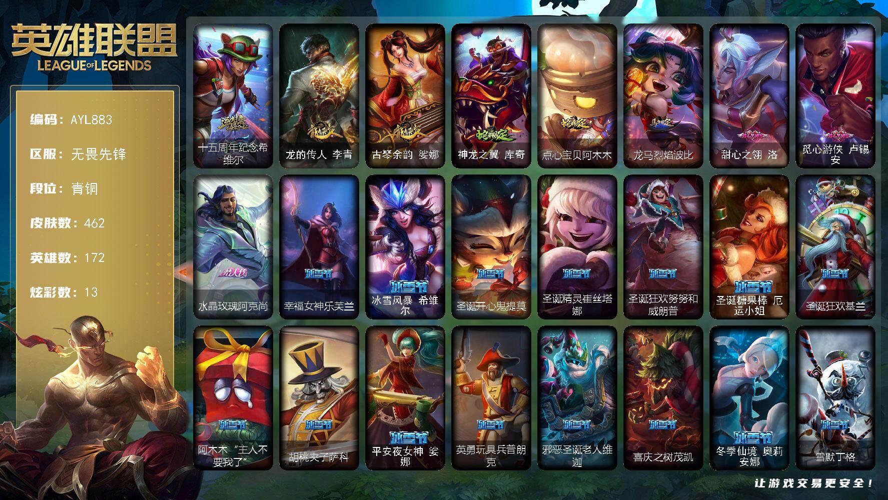 青铜段位-172英雄-462皮肤-13炫彩-1终极-1神话-80限定-37传说