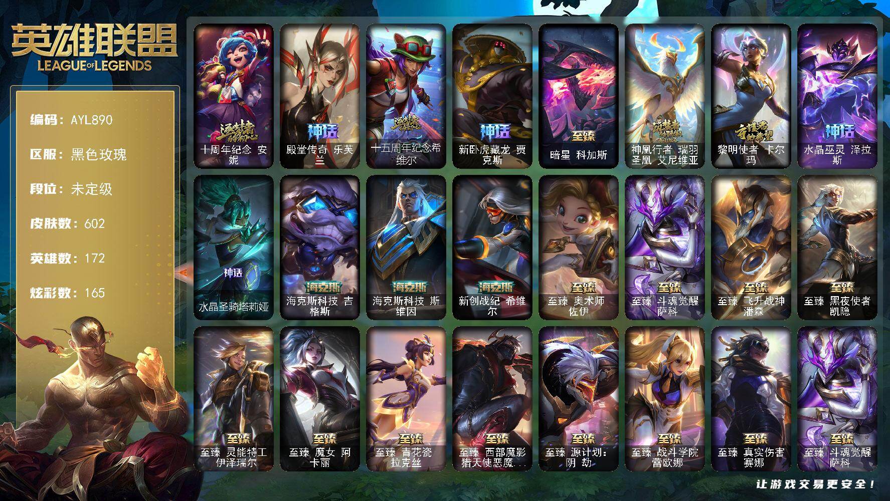 未定级段位-172英雄-602皮肤-165炫彩-1终极-23神话-96限定-5