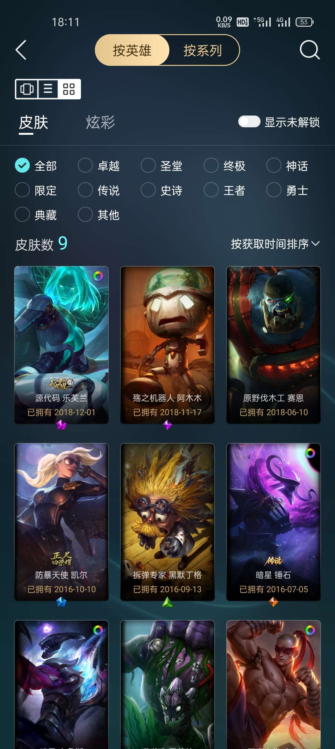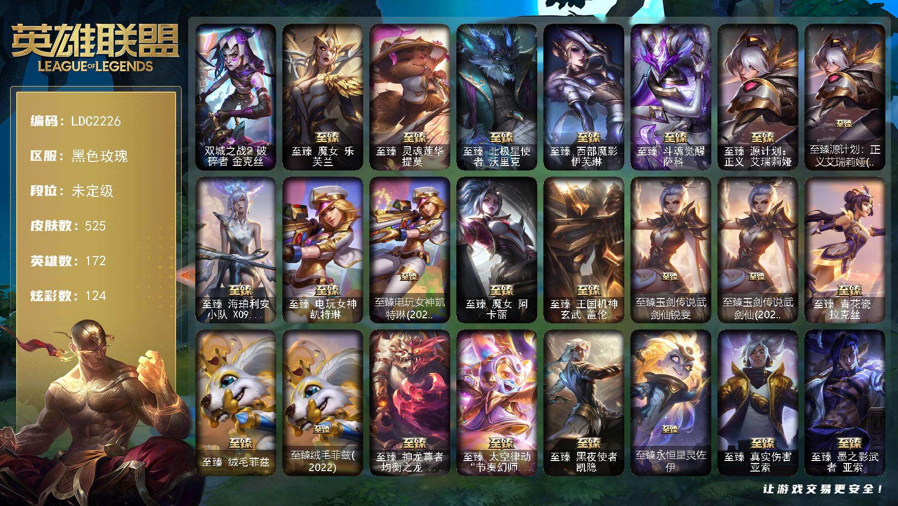 172英雄/525皮肤/48神话/52限定/12臻彩/124炫彩/48传说/125史诗/未定级/