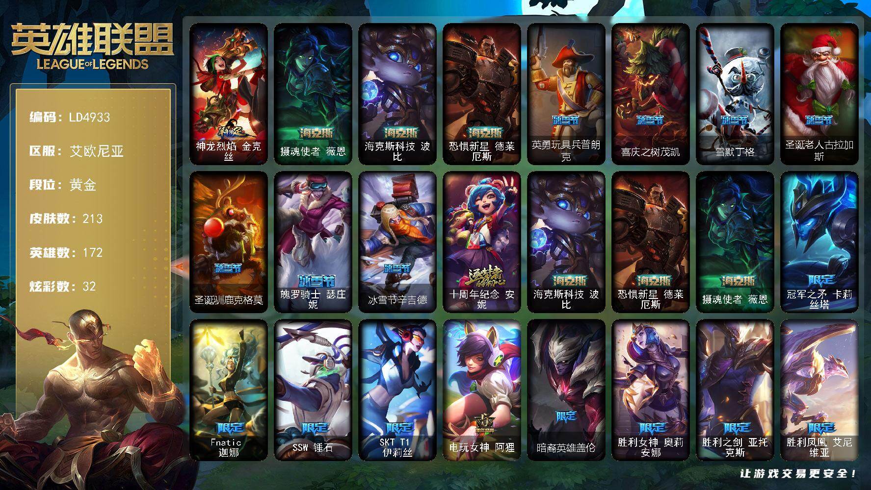172英雄/213皮肤/4神话/31限定/2臻彩/32炫彩/29传说/52史诗