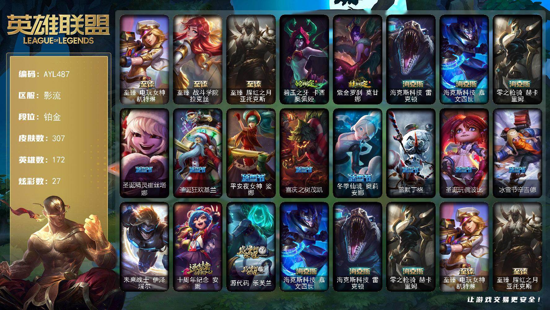 【特价出售/店主推荐】铂金段位-172英雄-307皮肤-27炫彩-1终极-8神