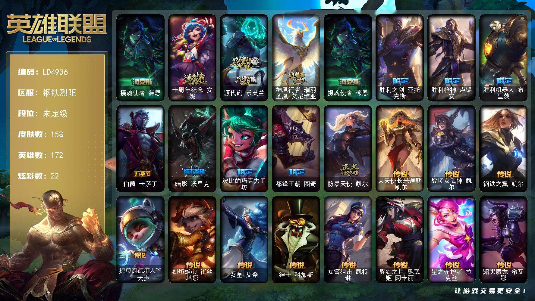172英雄/158皮肤/4神话/8限定/22炫彩/14传说/48史诗