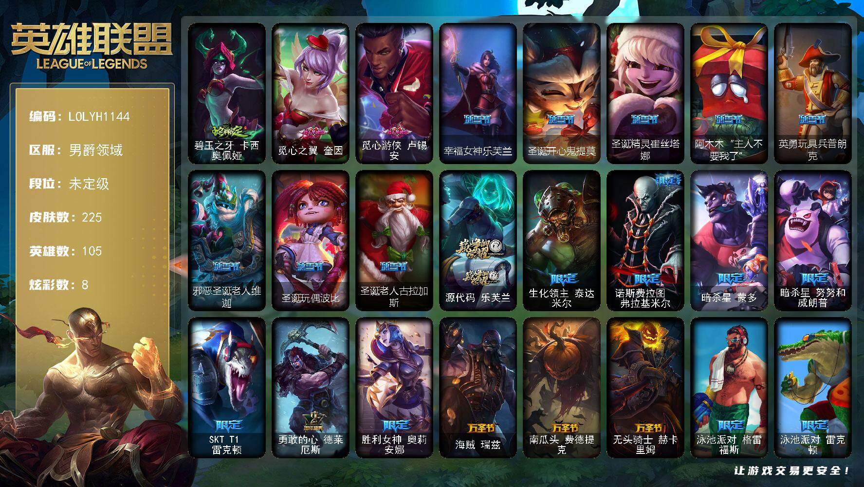 105英雄/225皮肤/1神话/30限定/1臻彩/8炫彩/18传说/66史诗/未定级