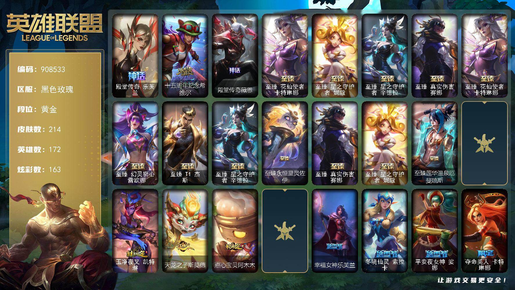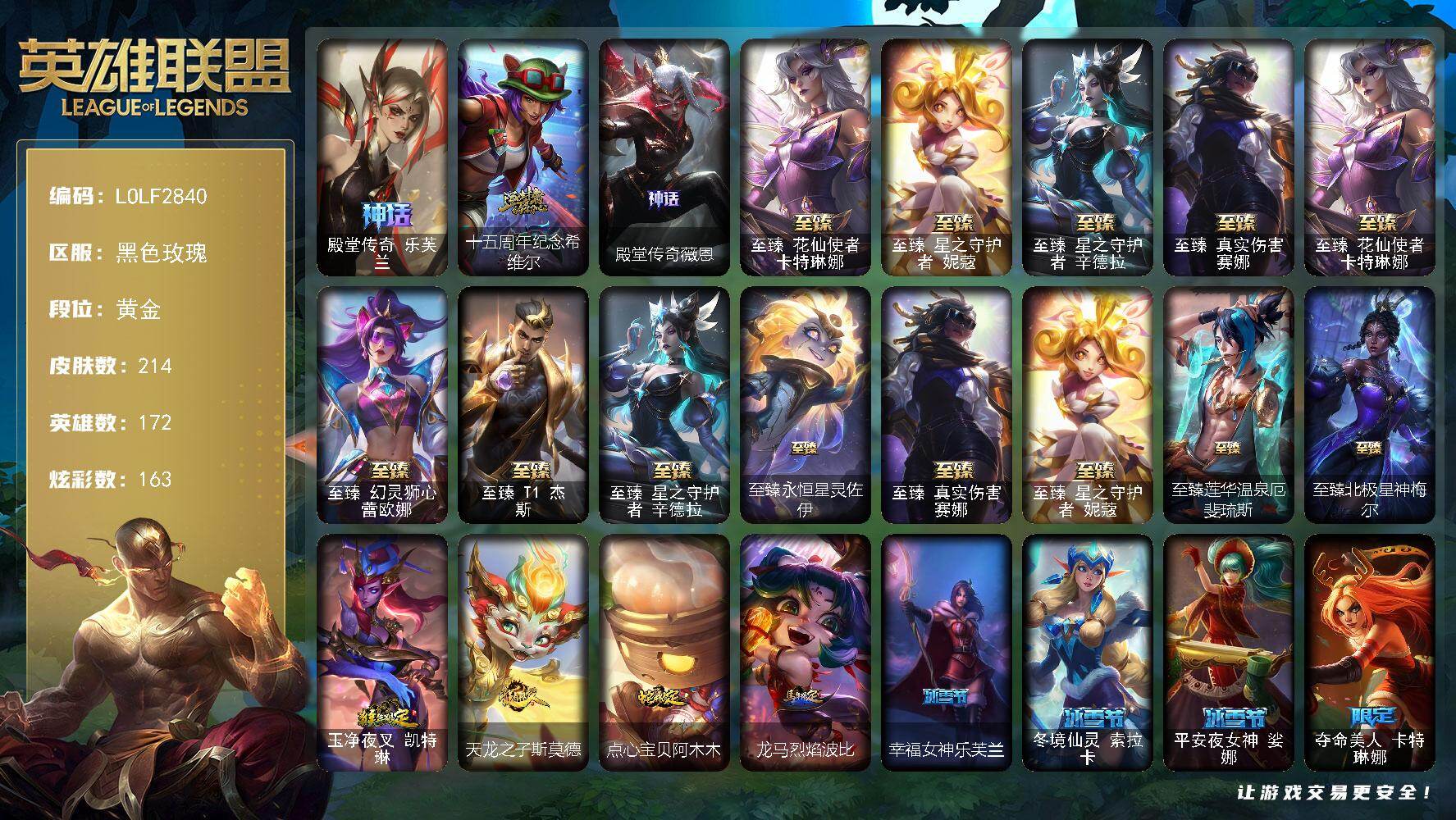 黄金段位-172英雄-214皮肤-163炫彩-1终极-12神话-38限定-16传说-27史诗