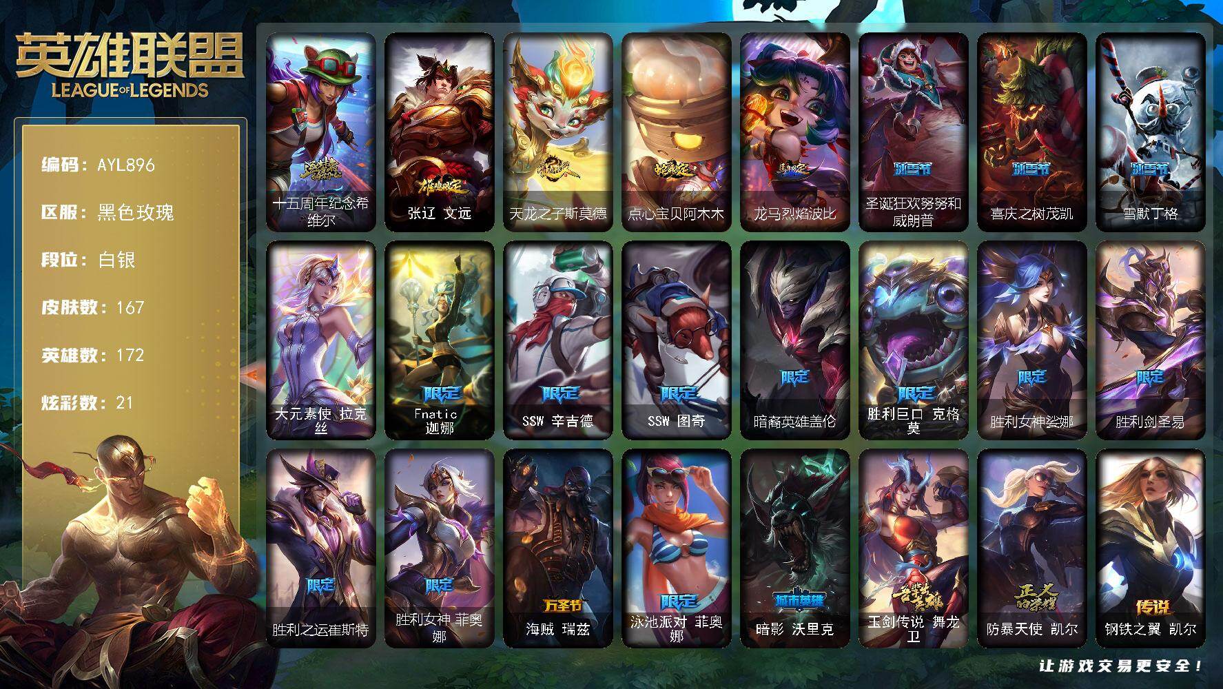 白银段位-172英雄-167皮肤-21炫彩-1终极-1神话-22限定-13传说