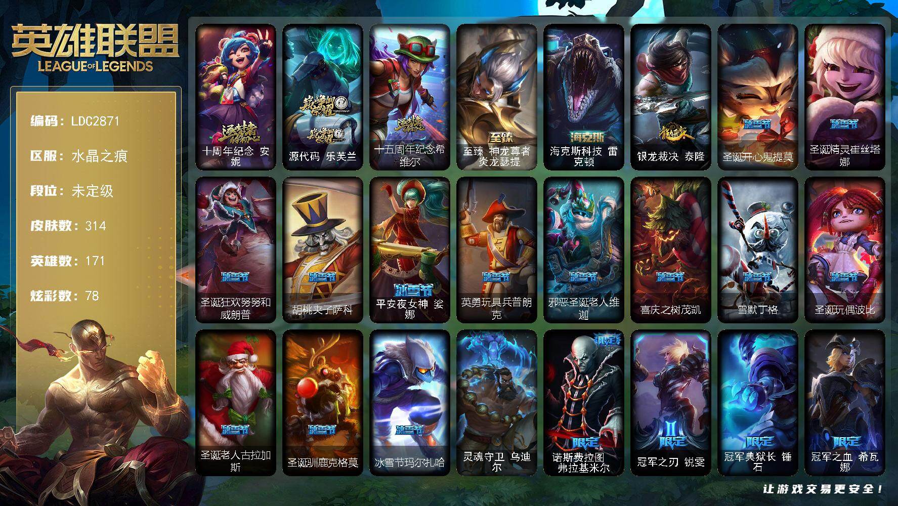 171英雄/314皮肤/1终极/5神话/47限定/5臻彩/78炫彩/35传说/84史诗/未定级/
