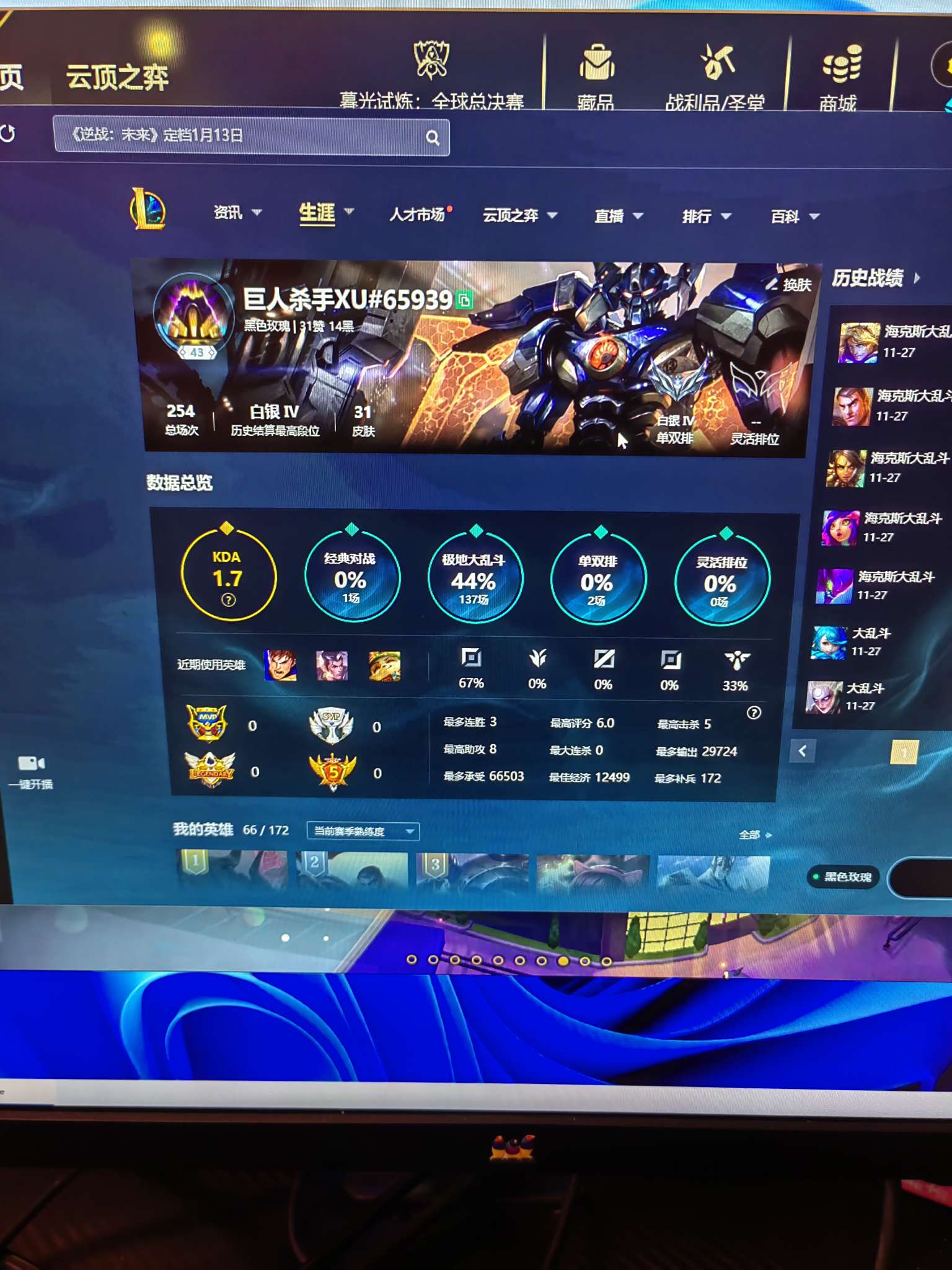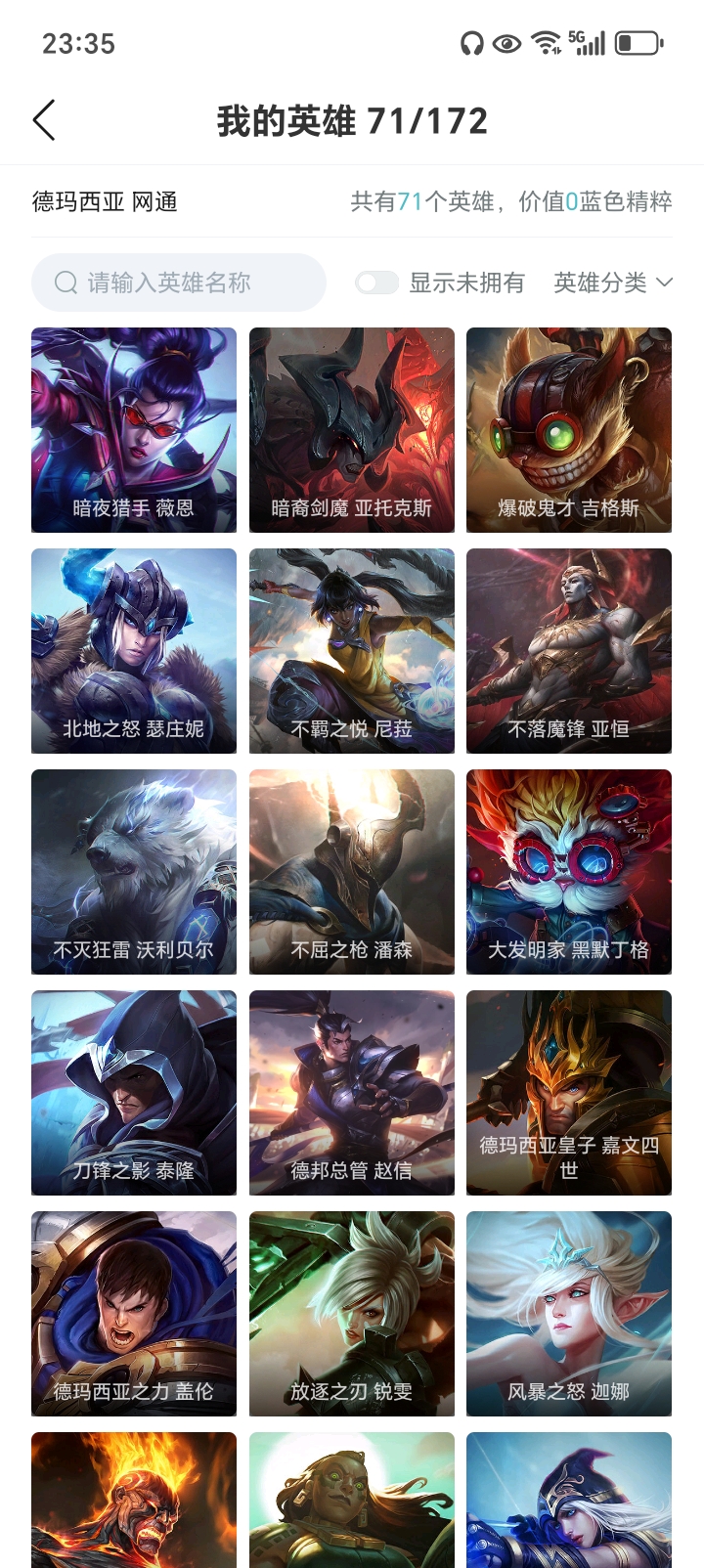 172英雄/126皮肤/1神话/15限定/3臻彩/26炫彩/14传说/31史诗/铂金/