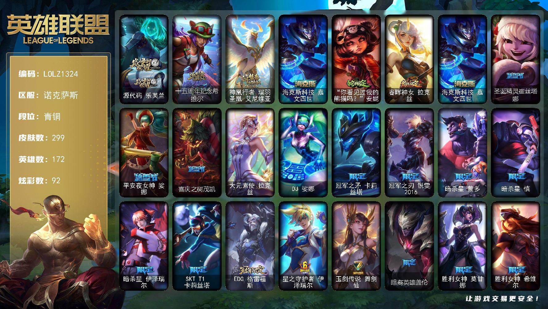 172英雄/299皮肤/2终极/4神话/37限定/3臻彩/92炫彩/23传说/75史诗/青铜/