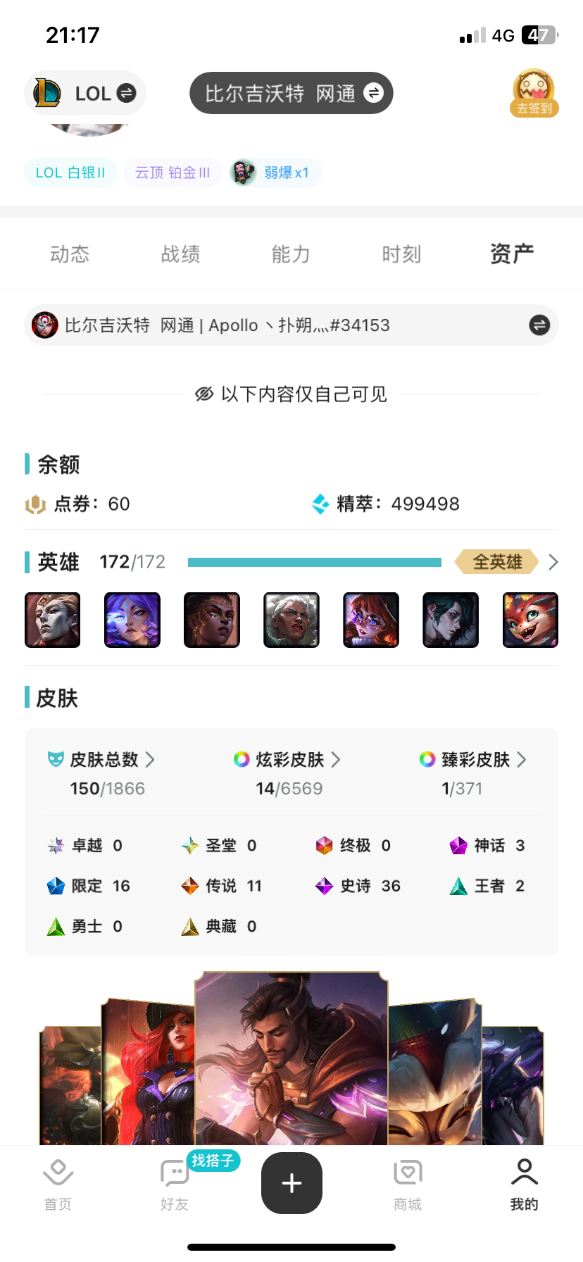 172英雄/139皮肤/3神话/10限定/1臻彩/13炫彩/16传说/33史诗/白银/
