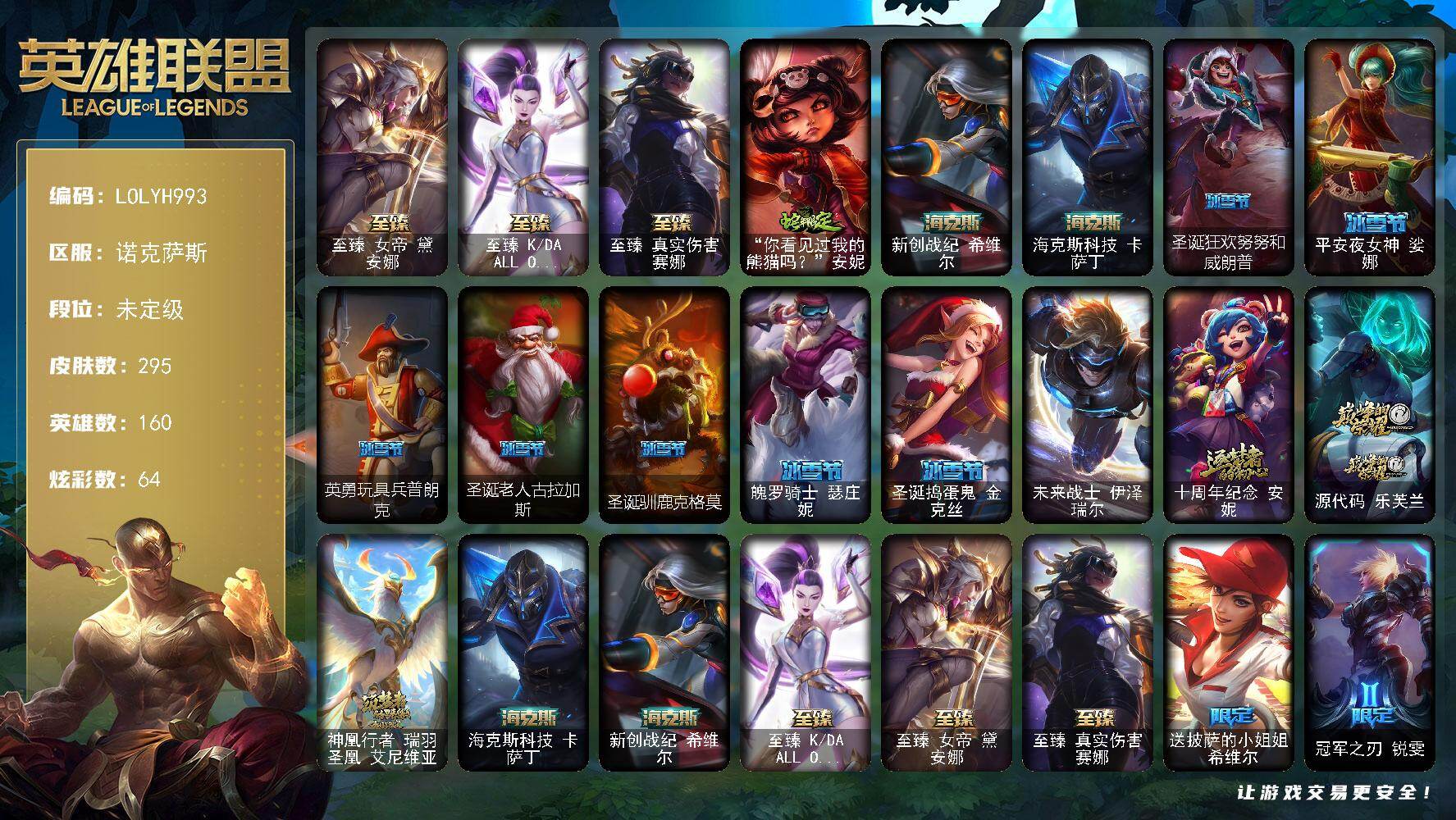 160英雄/295皮肤/1终极/8神话/38限定/1臻彩/64炫彩/24传说/82史诗/未定级/