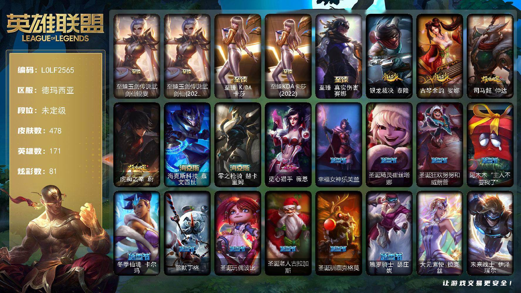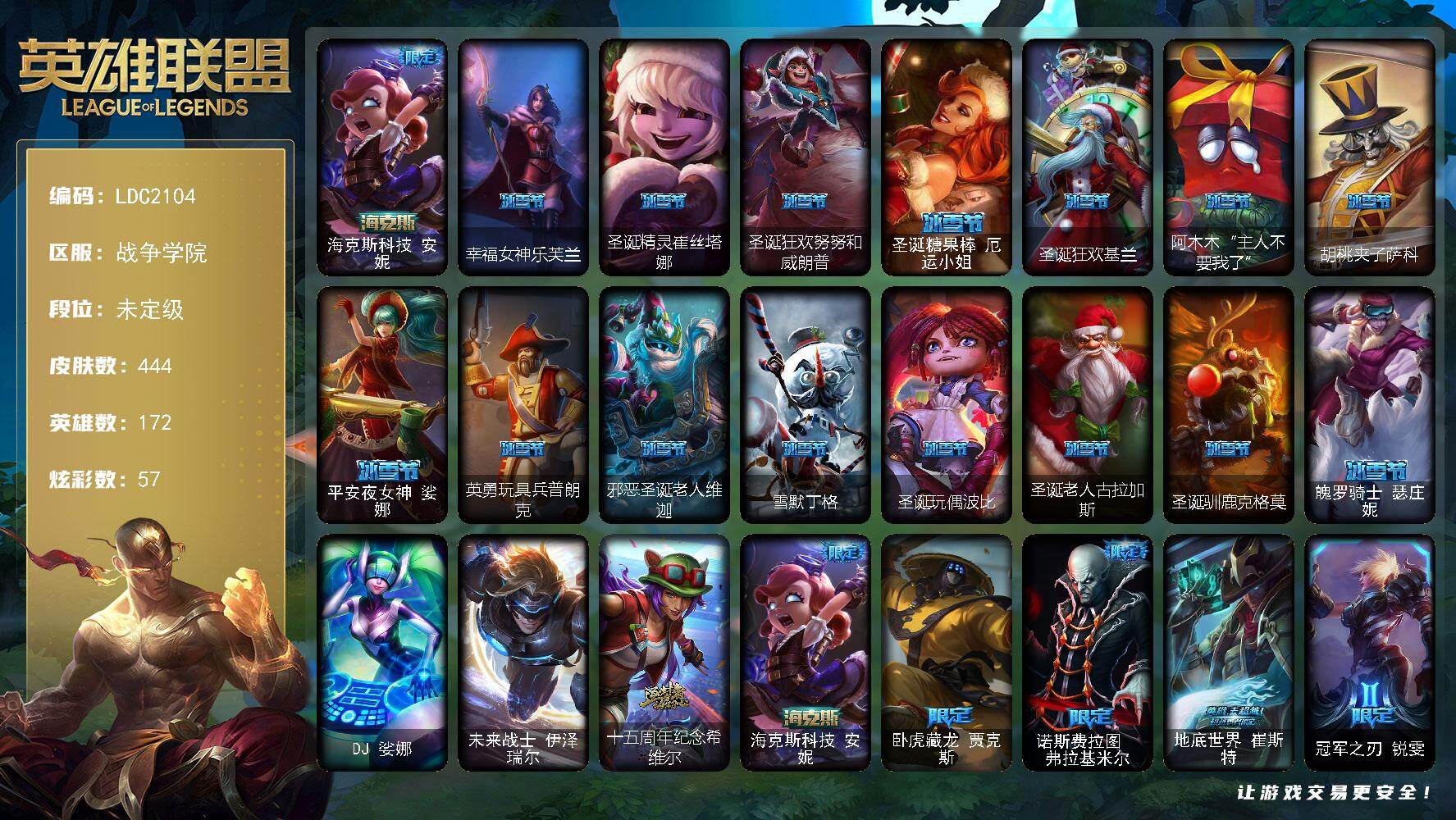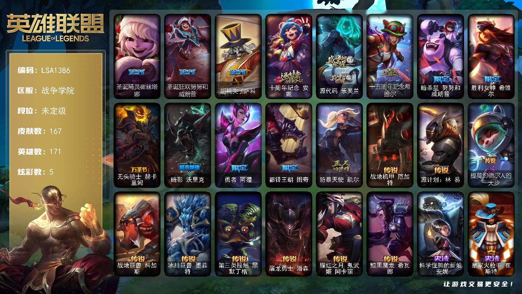 171英雄/167皮肤/3神话/10限定/5炫彩/9传说/48史诗/未定级账号等级:445/