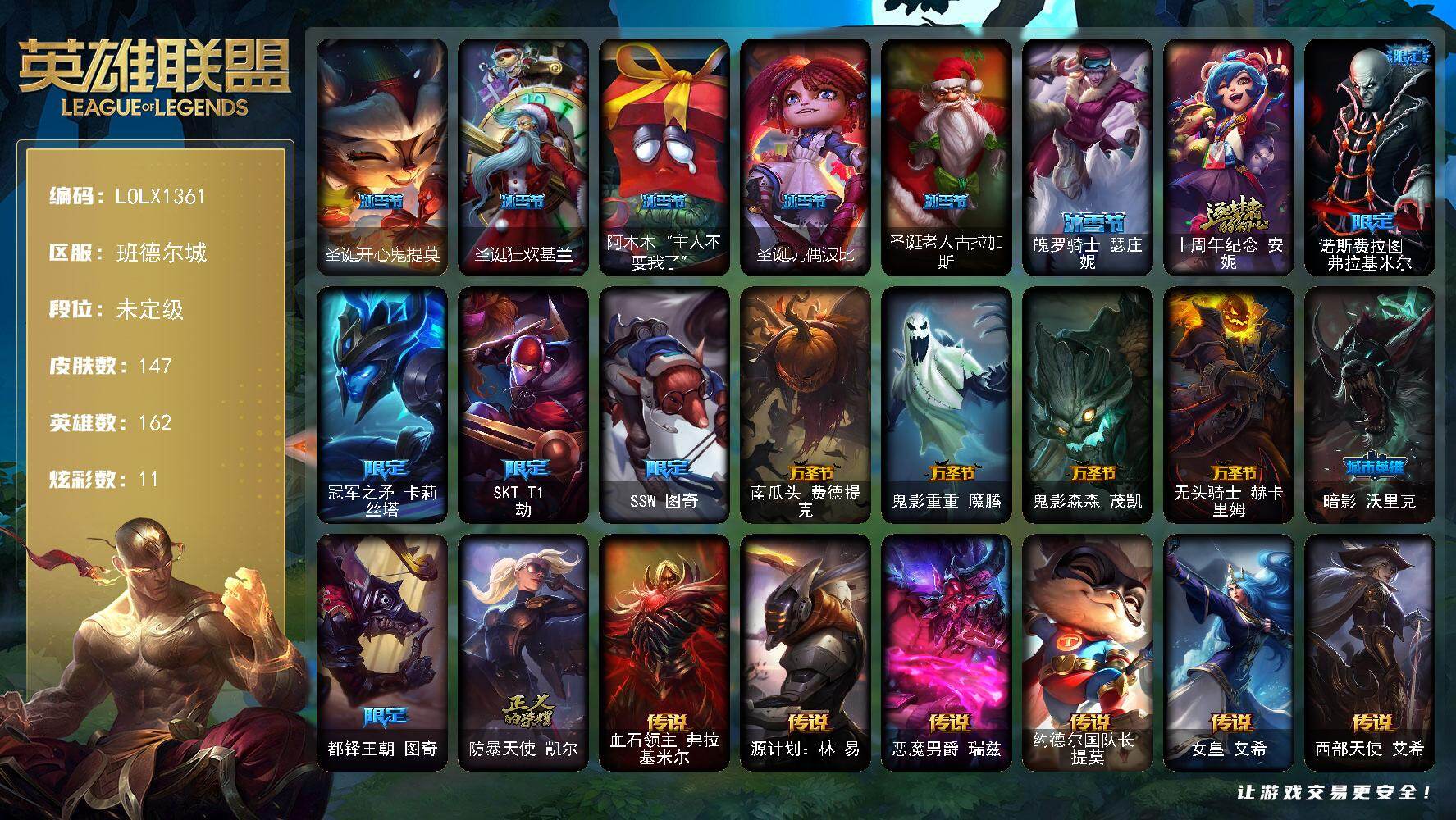 162英雄/147皮肤/1神话/17限定/11炫彩/9传说/38史诗