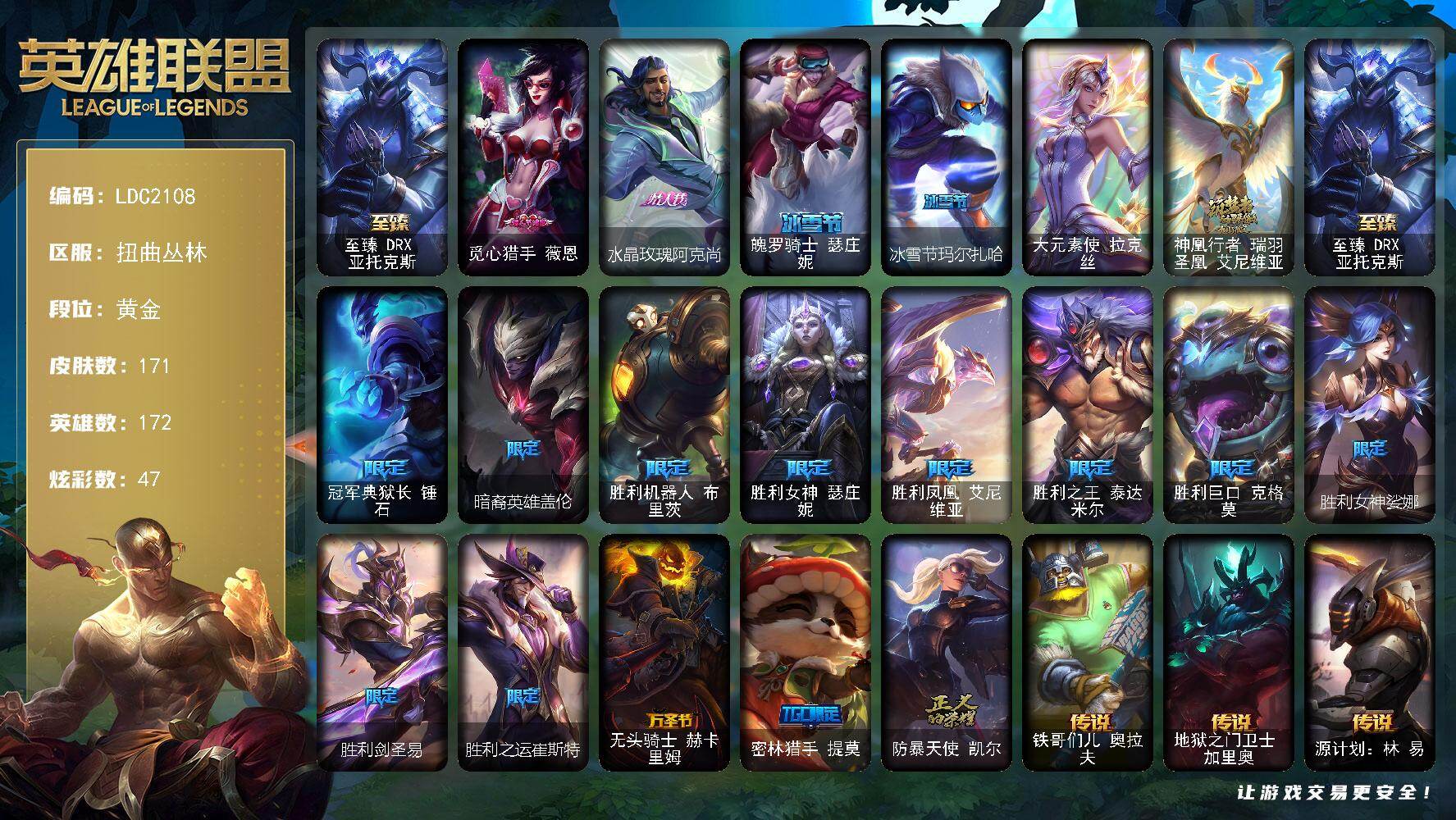 172英雄/171皮肤/1终极/2神话/17限定/6臻彩/47炫彩/15传说/45史诗