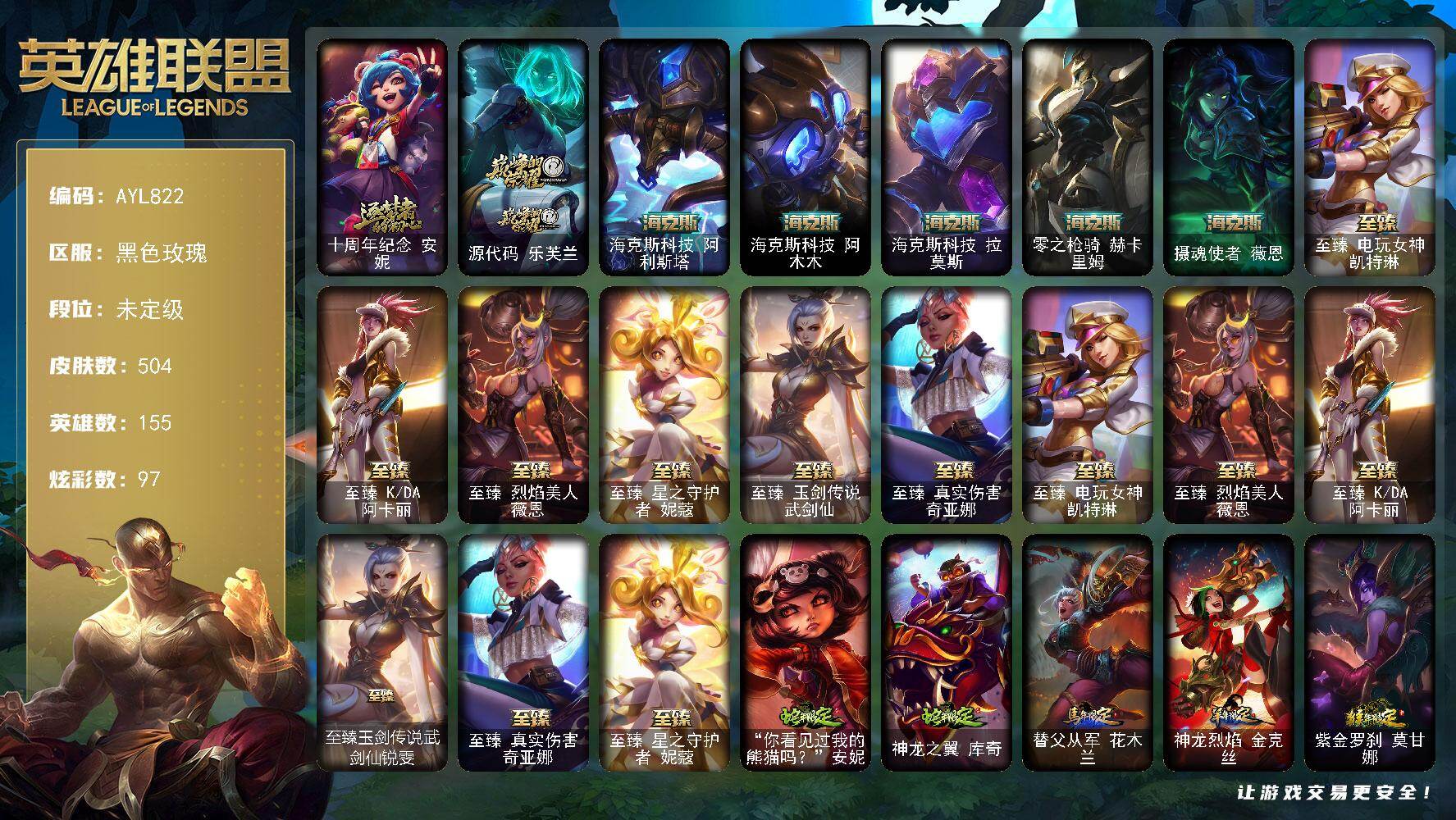 未定级段位-155英雄-504皮肤-97炫彩-5终极-13神话-75限定-44传说-