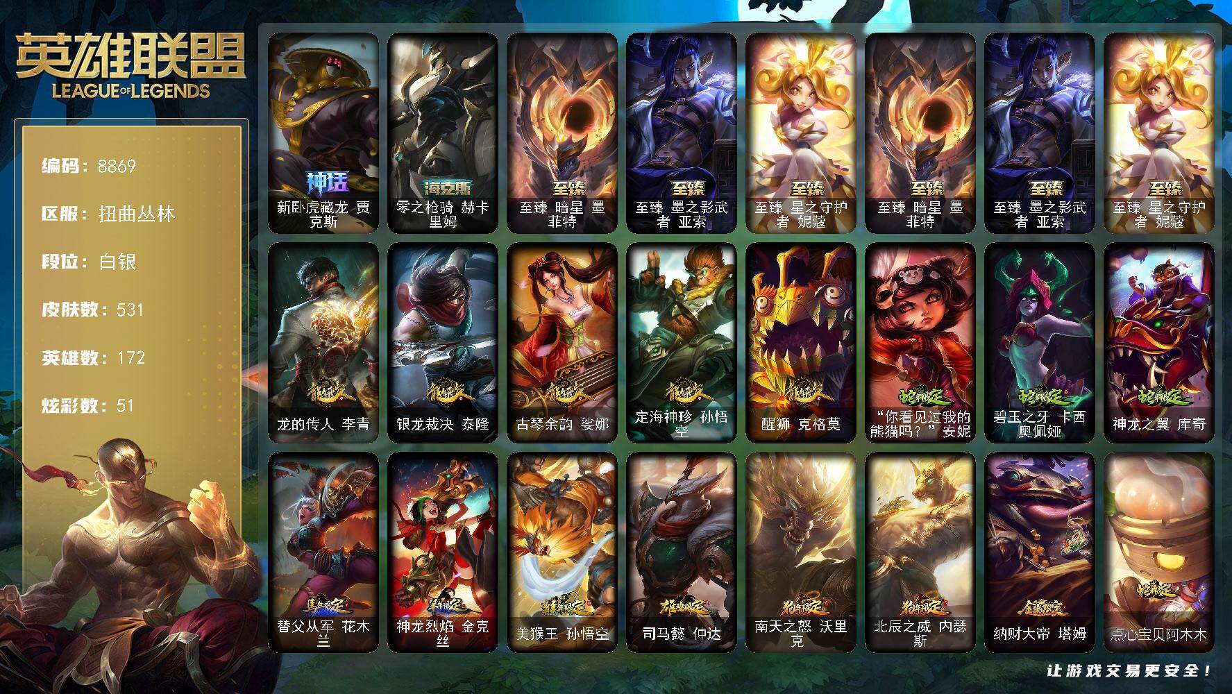 单双白银段位-172英雄-531皮肤-51炫彩-2终极-5神话-101限定-39传说