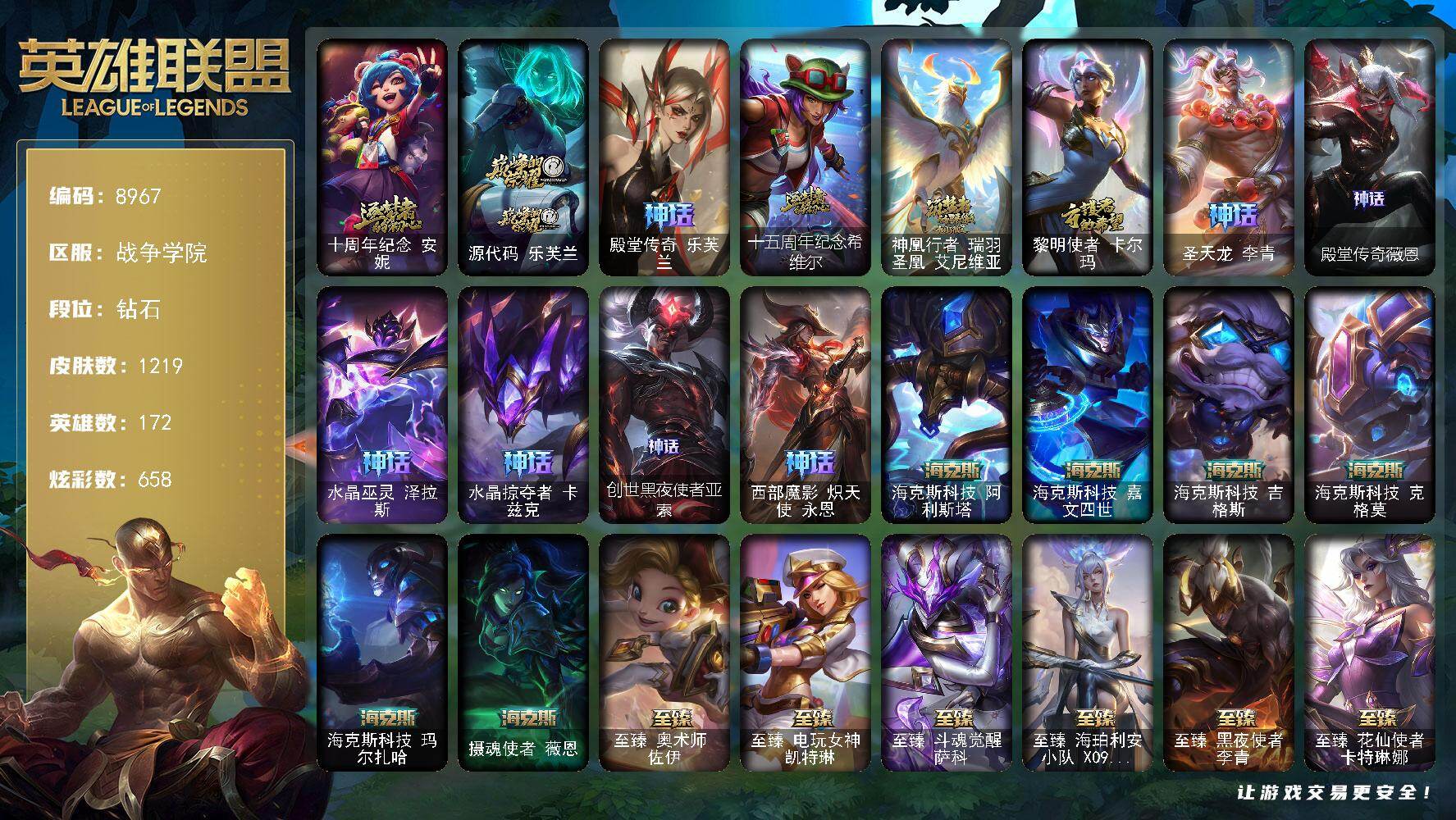 钻石段位-172英雄-1219皮肤-658炫彩-8终极-65神话-247限定-115传说-152史诗