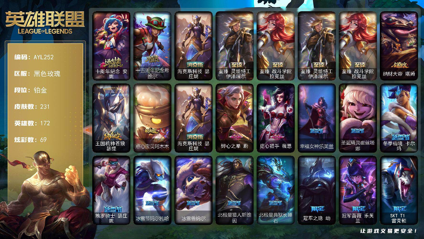 【特价出售/店主推荐】铂金段位-172英雄-231皮肤-69炫彩-0终极-5神