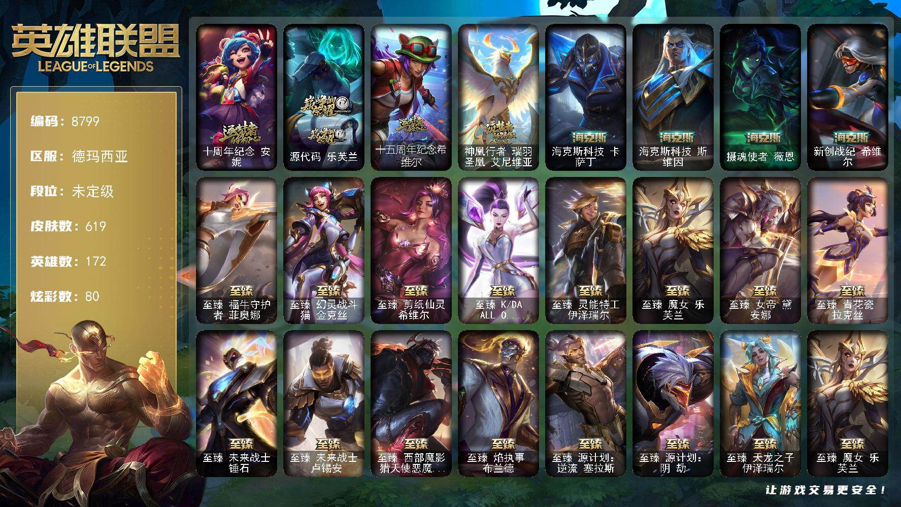 未定级段位-172英雄-619皮肤-80炫彩-1终极-24神话-119限定-58传说-153史诗