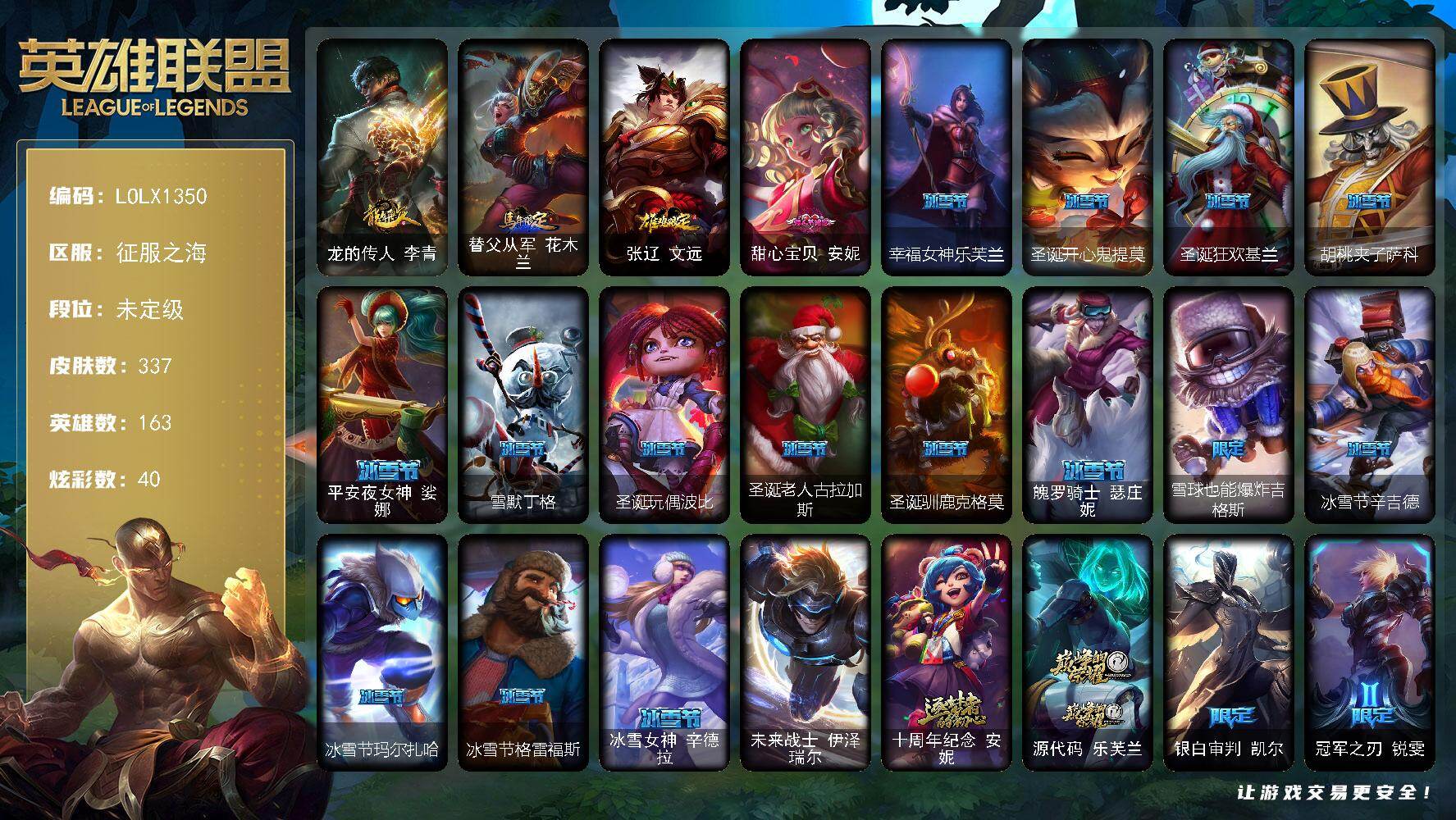 163英雄/337皮肤/1终极/2神话/61限定/2臻彩/40炫彩/27传说/95史诗/未定级/