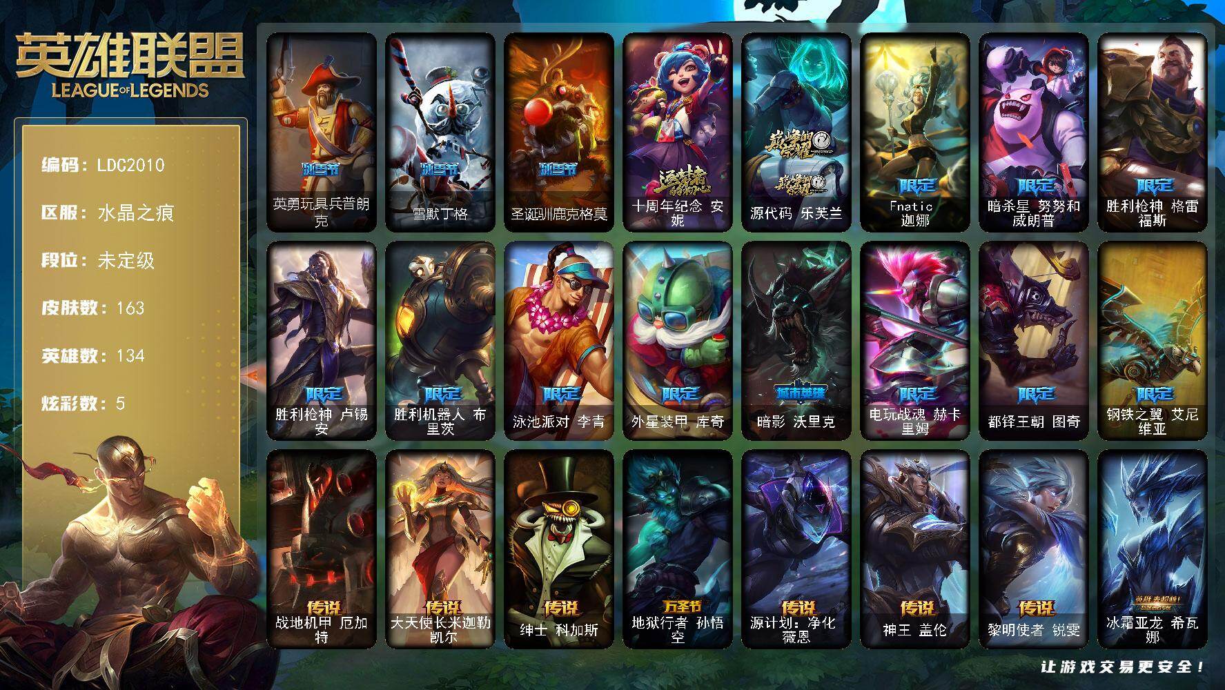 134英雄/163皮肤/2神话/14限定/5炫彩/11传说/47史诗/未定级/