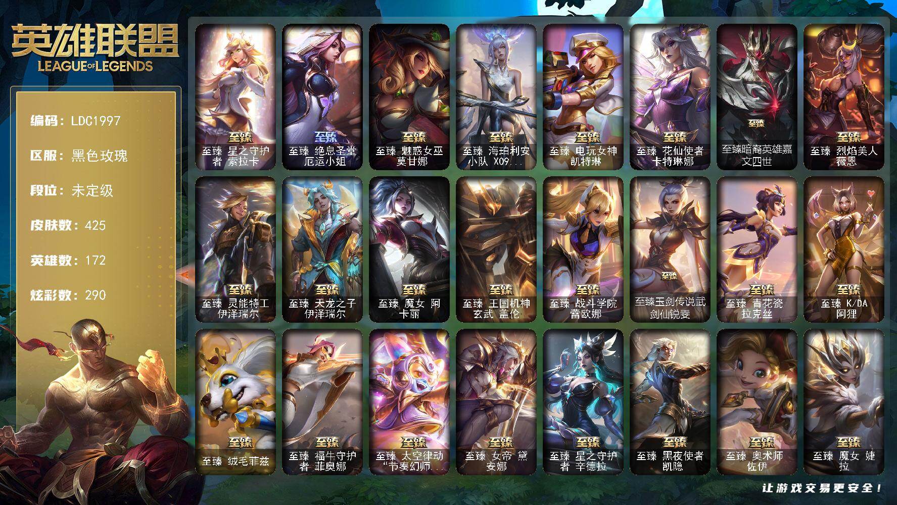 172英雄/425皮肤/3终极/47神话/70限定/15臻彩/290炫彩/60传说/84史诗/未定级账号等级:841/