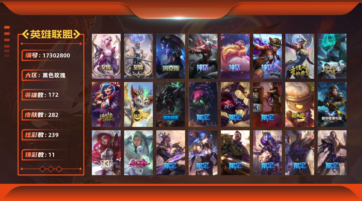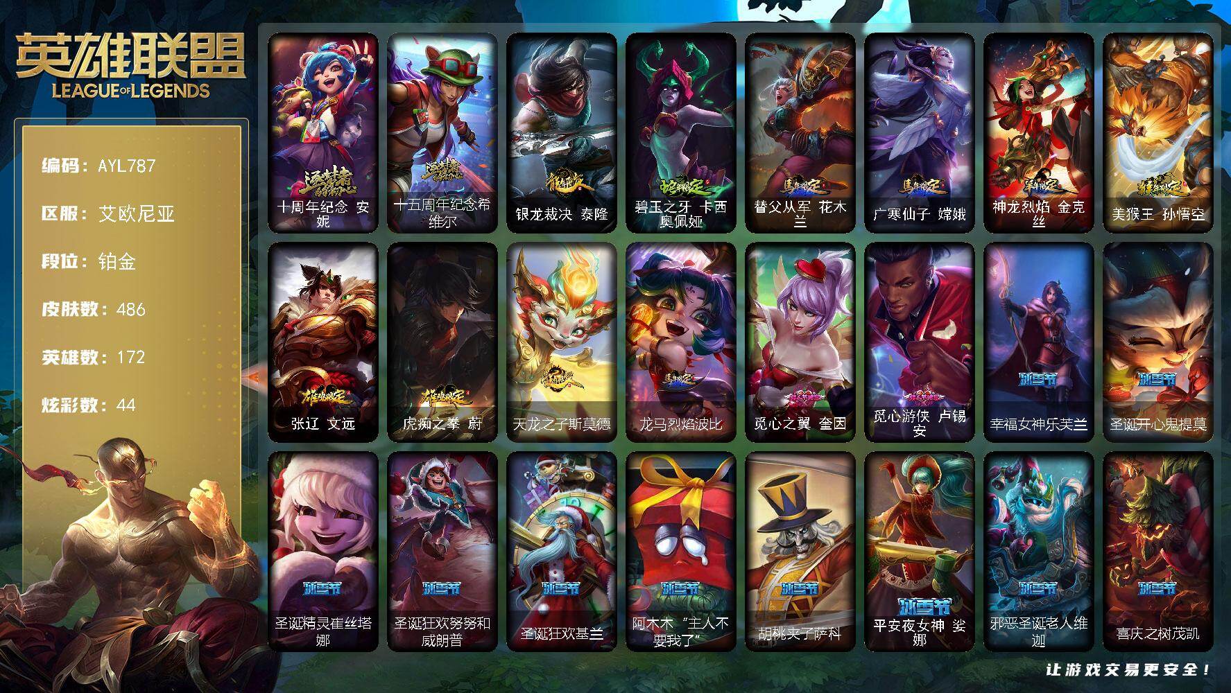铂金段位-172英雄-486皮肤-44炫彩-2终极-2神话-79限定-36传说-12