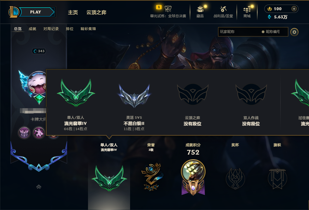 未定级段位-172英雄-348皮肤-26炫彩-1终极-4神话-56限定-30传说-