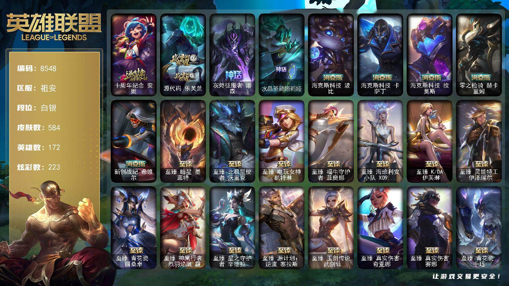白银段位-172英雄-584皮肤-223炫彩-5终极-27神话-89限定-62传说-114史诗
