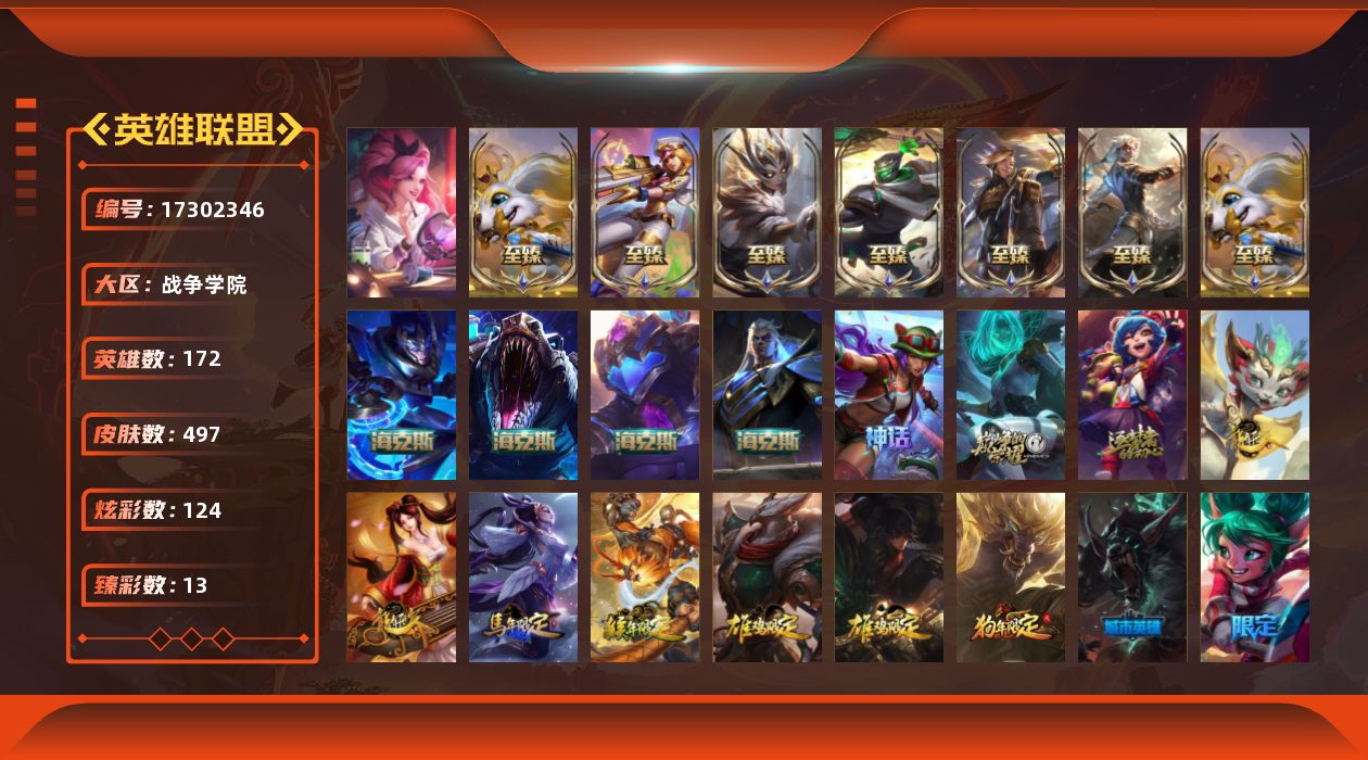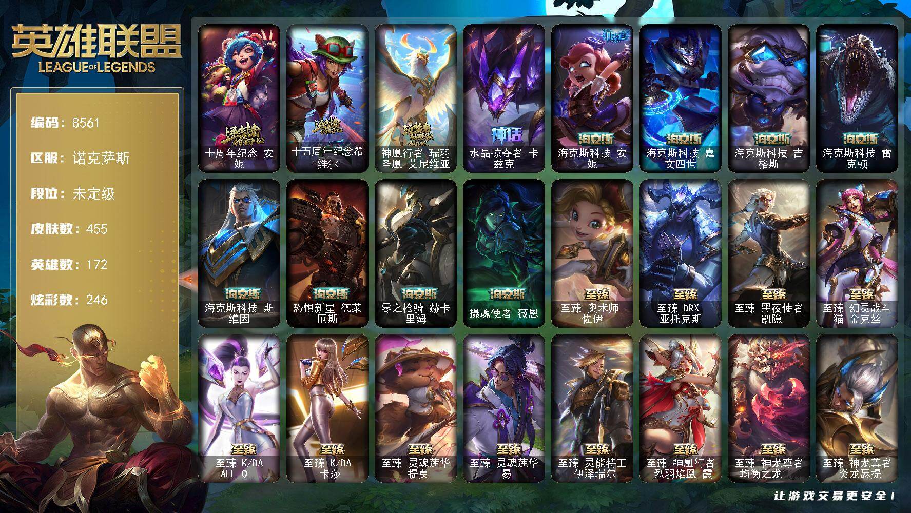 未定级段位-172英雄-455皮肤-246炫彩-1终极-32神话-72限定-55传说