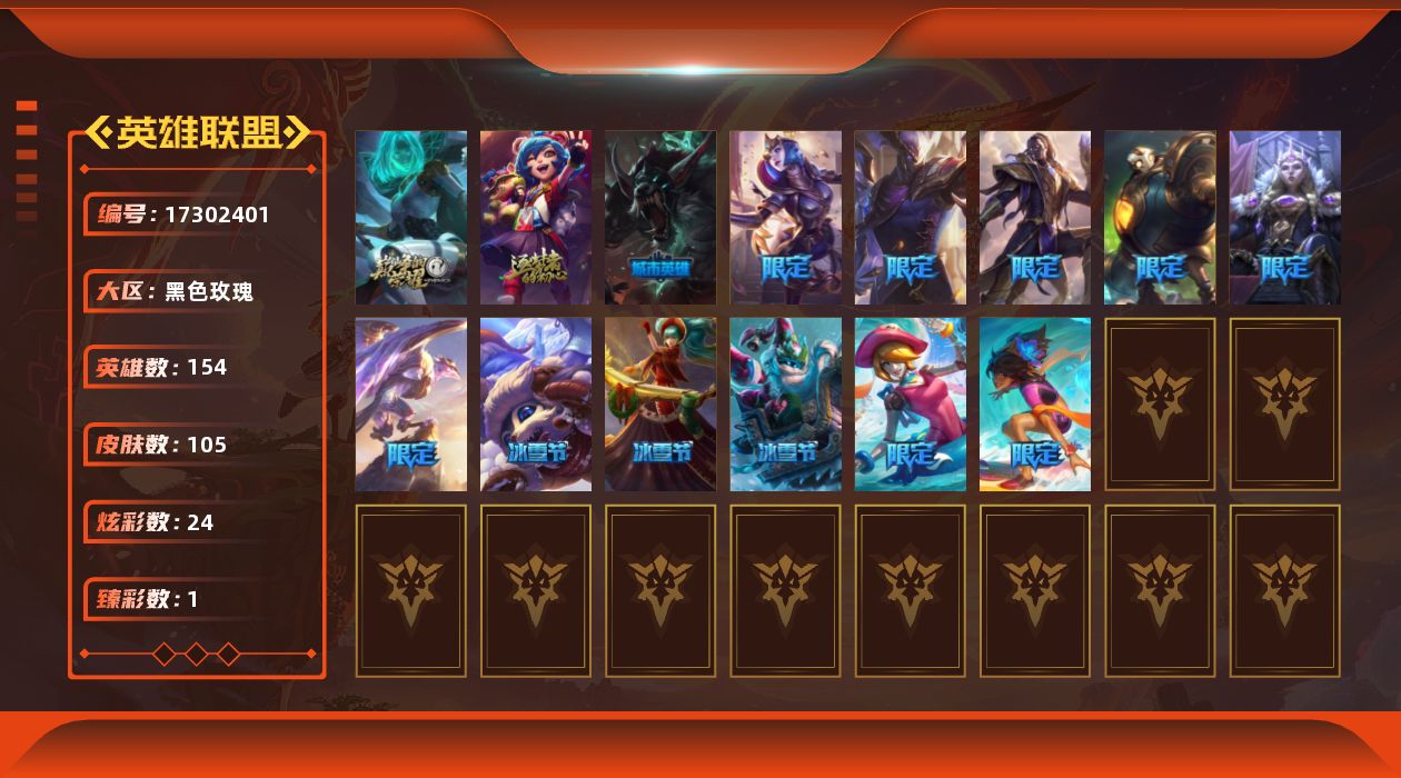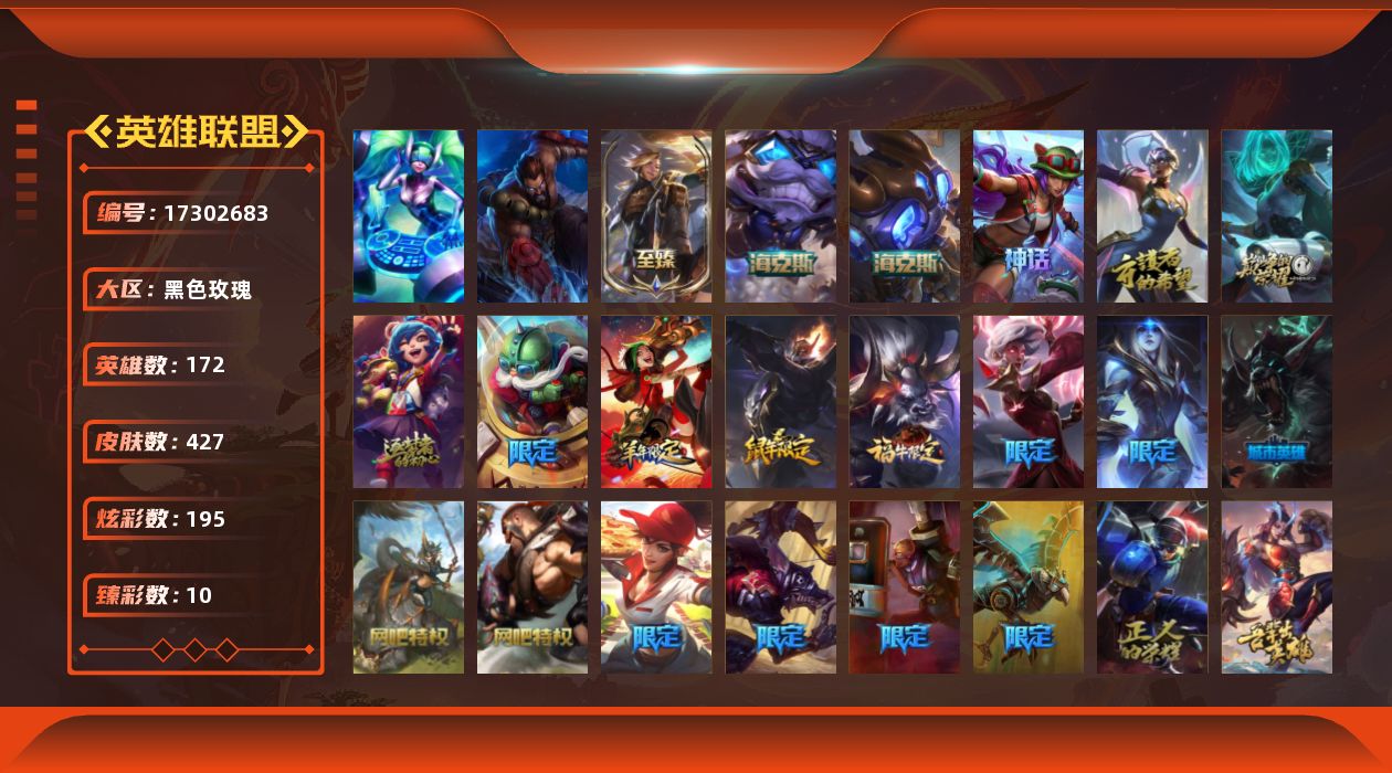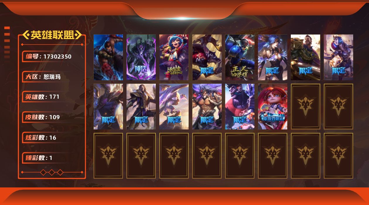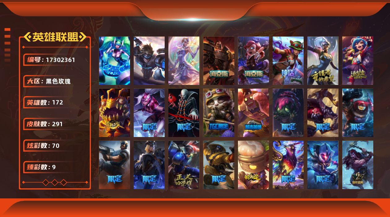 未定级段位-172英雄-210皮肤-48炫彩-0终极-10神话-10限定-20传说-