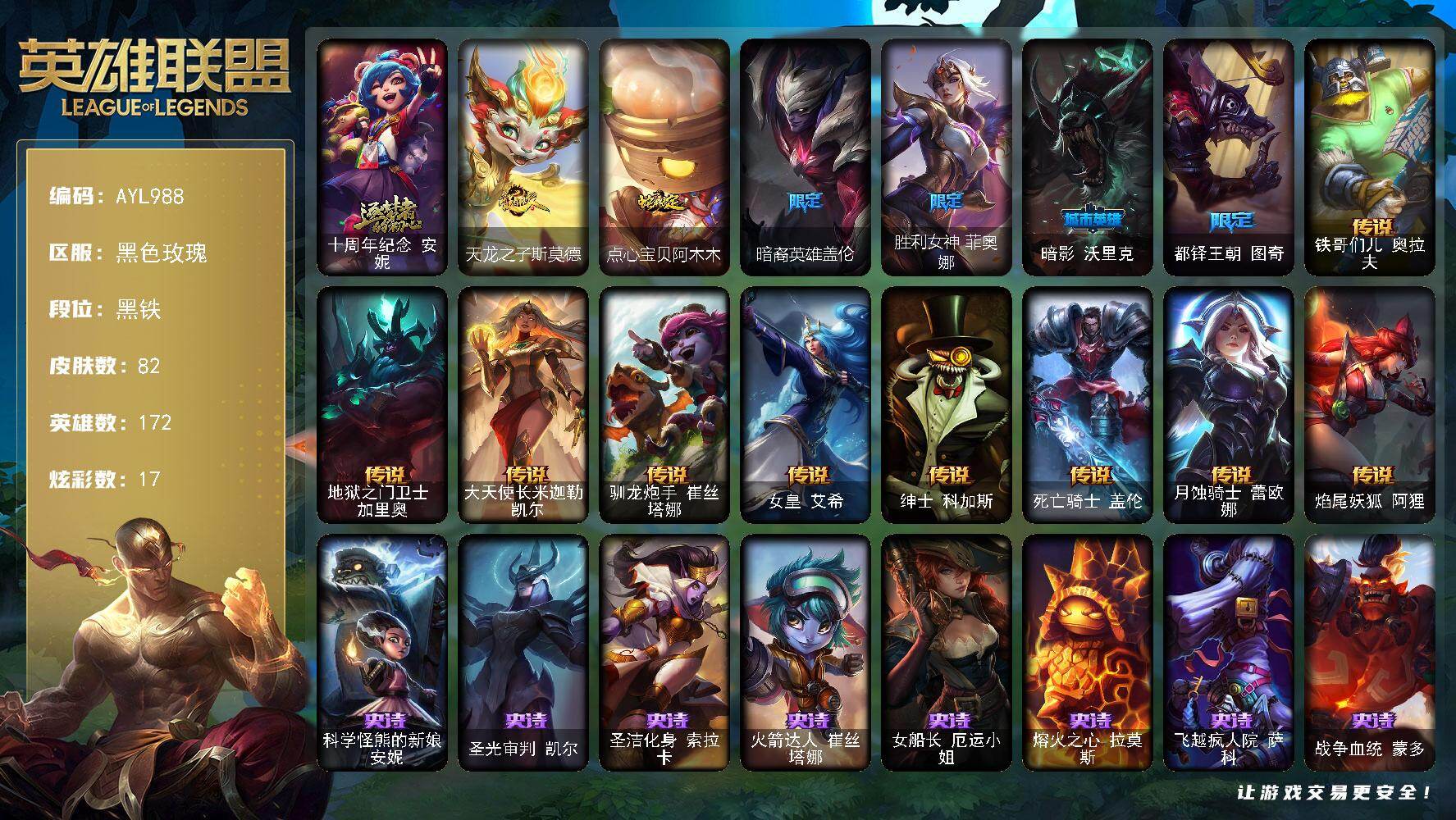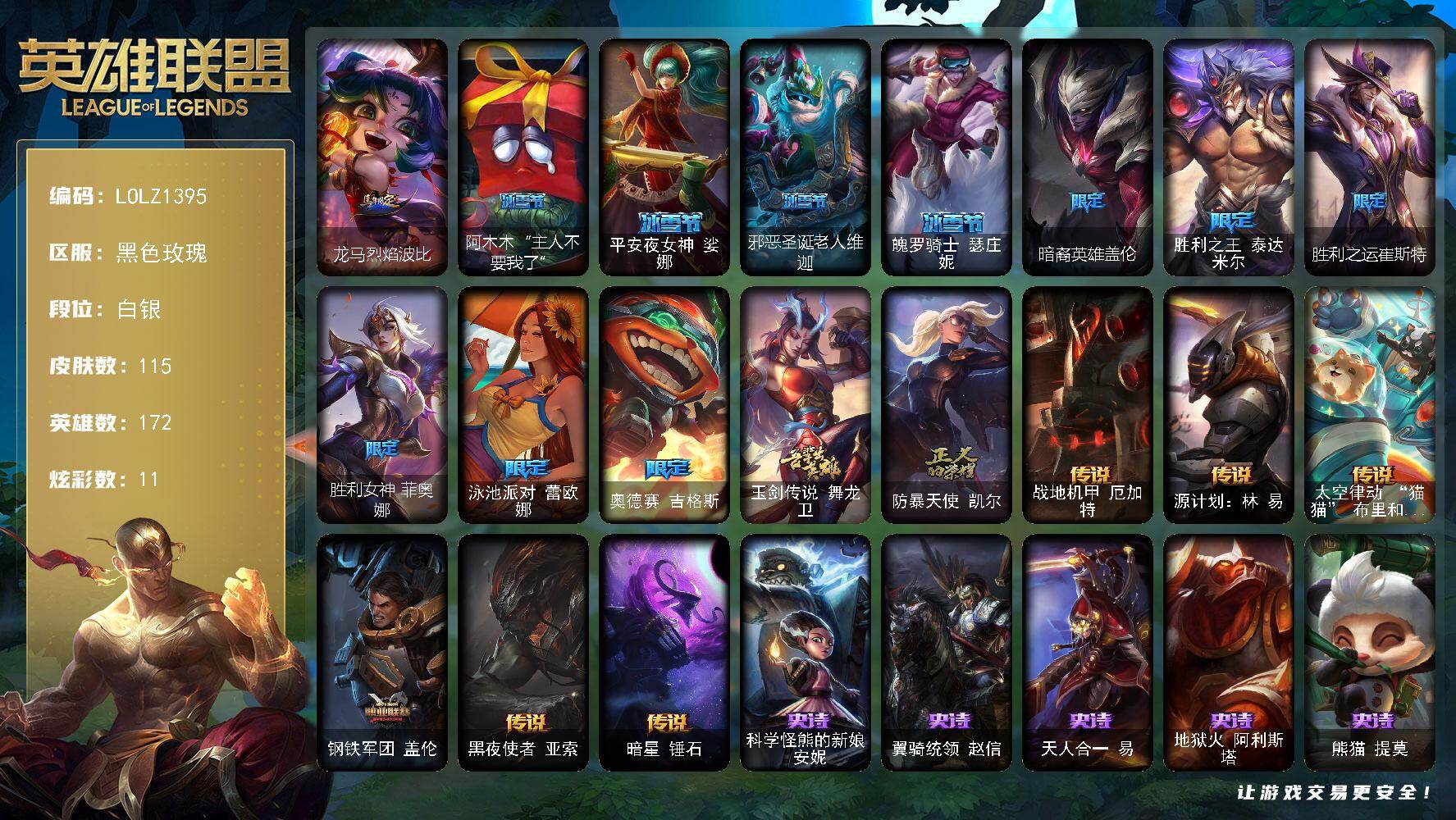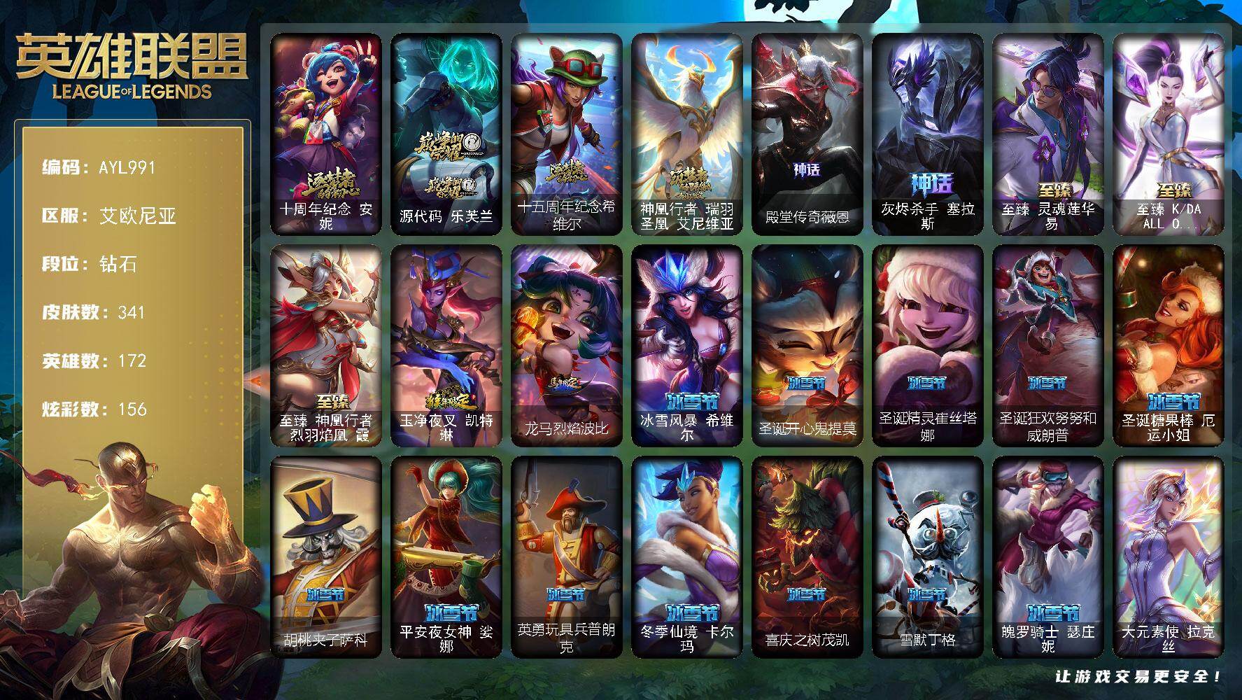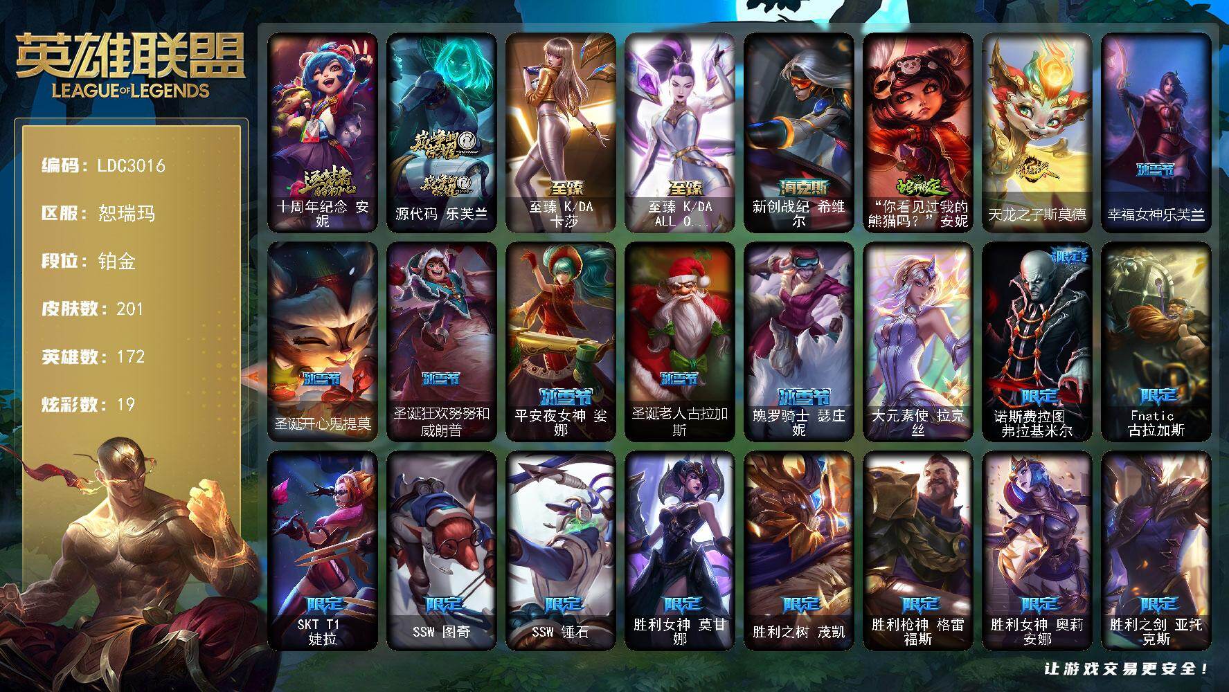 172英雄/201皮肤/1终极/5神话/31限定/19炫彩/22传