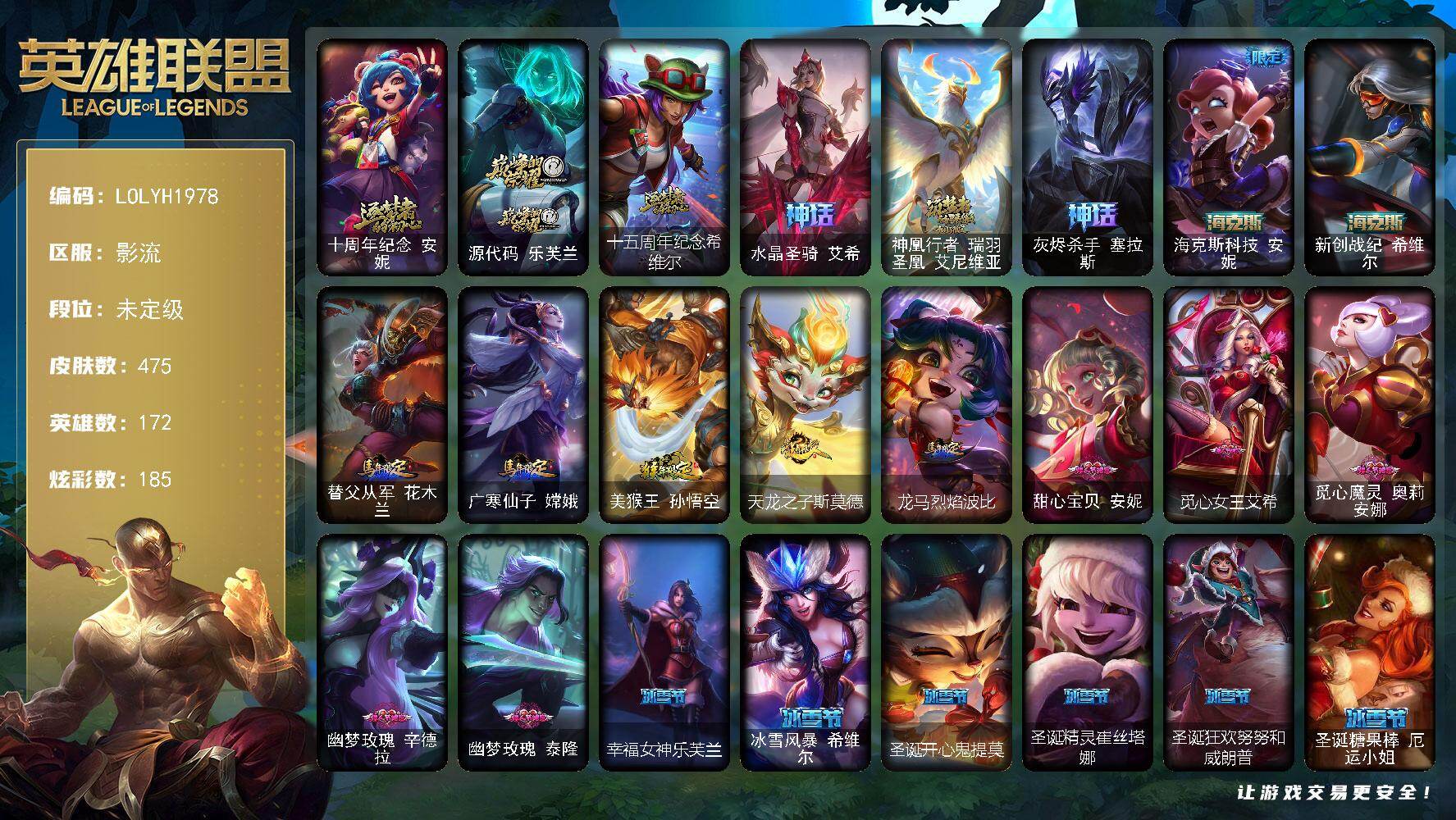 172英雄/475皮肤/2终极/8神话/91限定/13臻彩/185炫彩/43传说/106史诗/未定级/