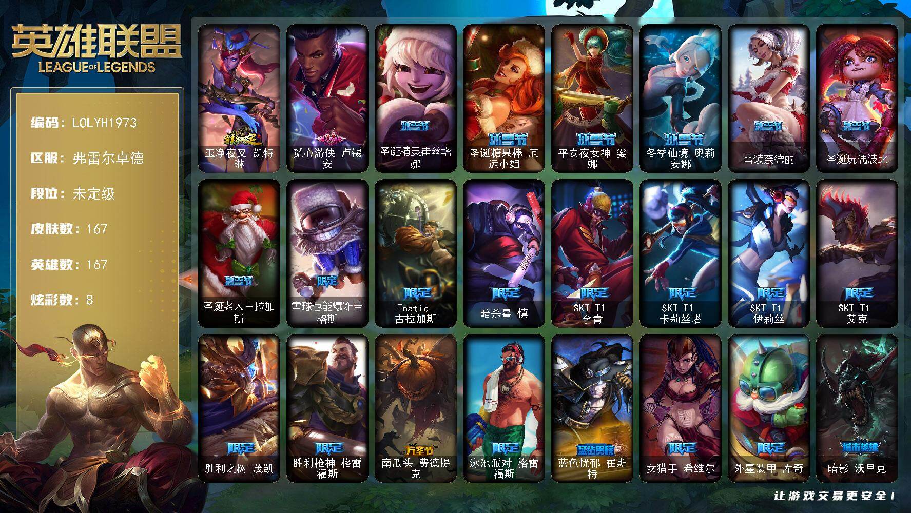 167英雄/167皮肤/30限定/8炫彩/17传说/38史诗/