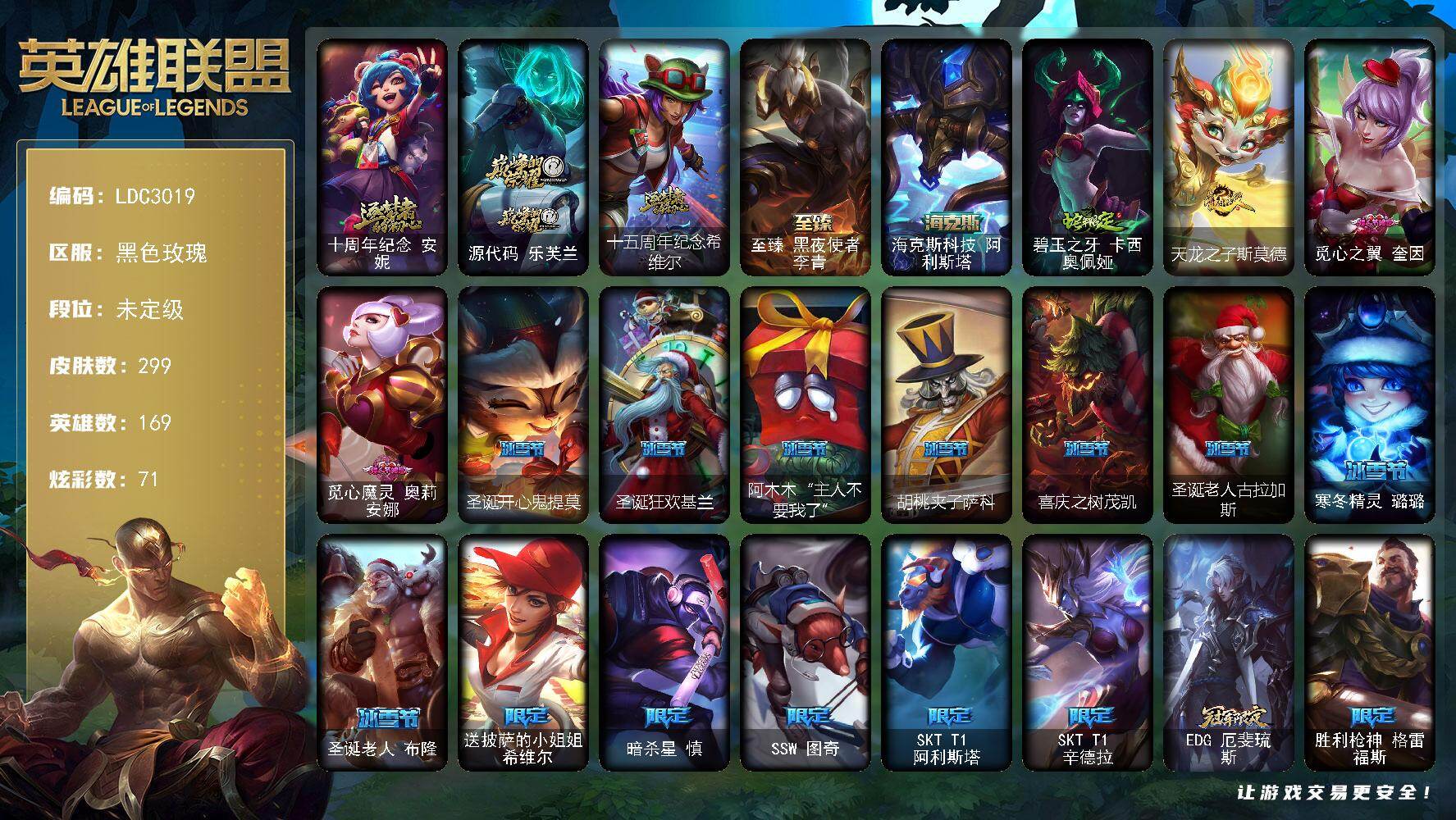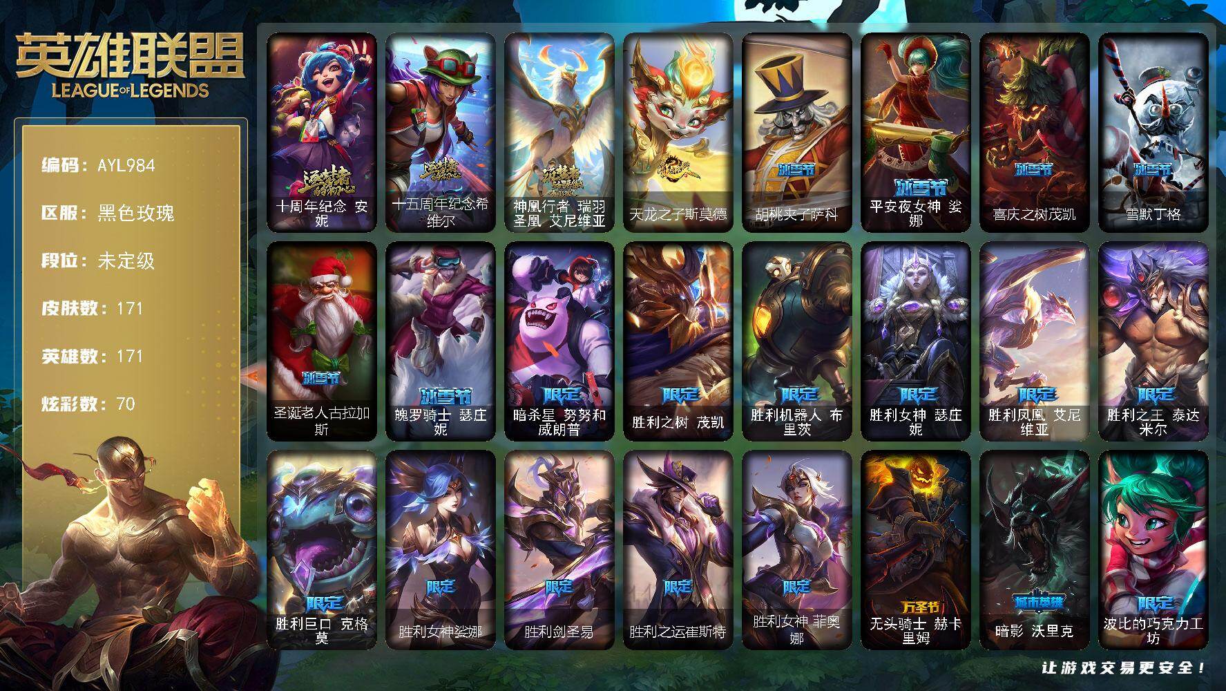 未定级段位-171英雄-171皮肤-70炫彩-0终极-3神话-23限定-14传说-4