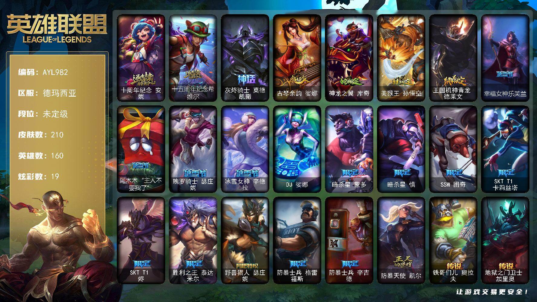 【店主推荐捡漏号】未定级段位-160英雄-210皮肤-19炫彩-1终极-3神话-18