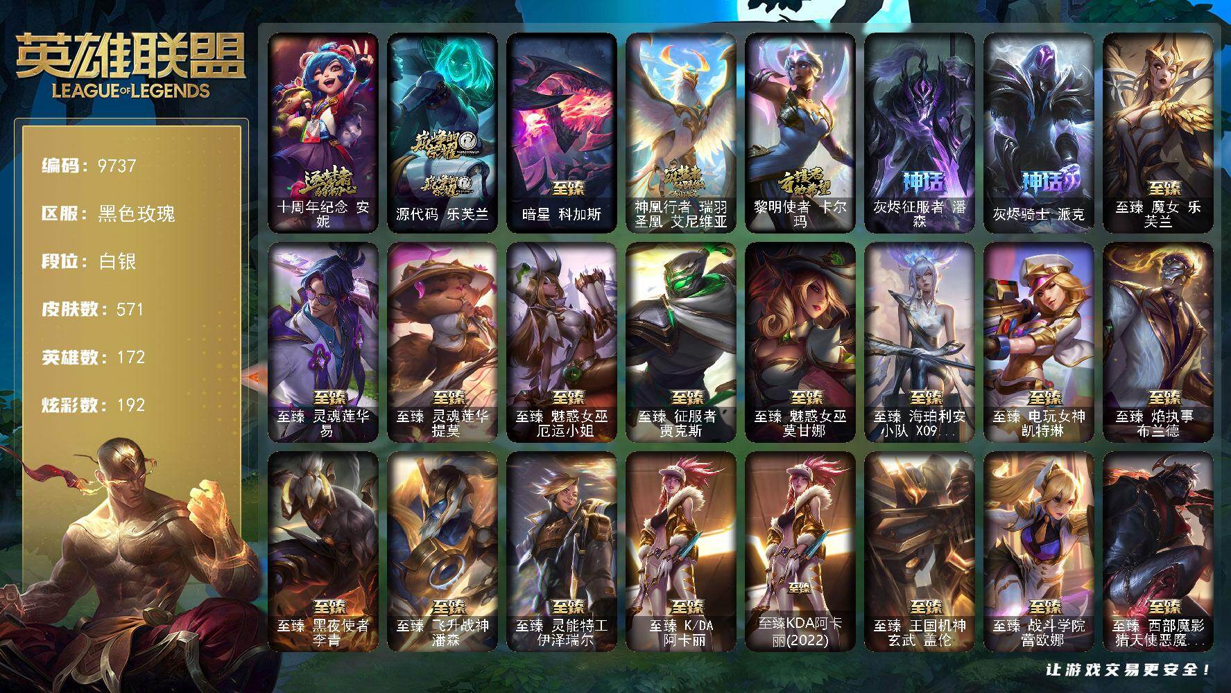 白银段位-172英雄-571皮肤-192炫彩-2终极-50神话-96限定-50传说-