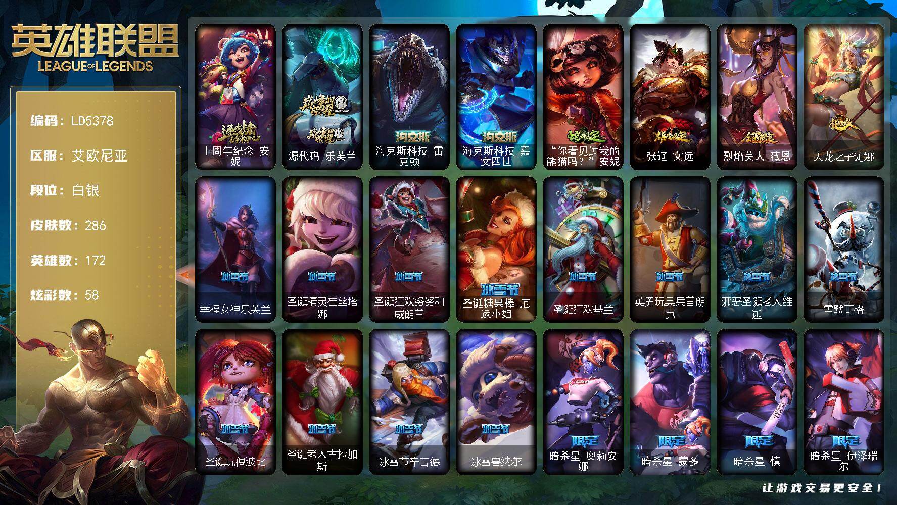 白银段位-172英雄-286皮肤-58炫彩-0终极-4神话-47限定-19传说-69
