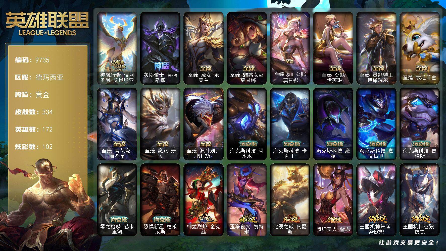 黄金段位-172英雄-334皮肤-102炫彩-1终极-18神话-48限定-42传说-