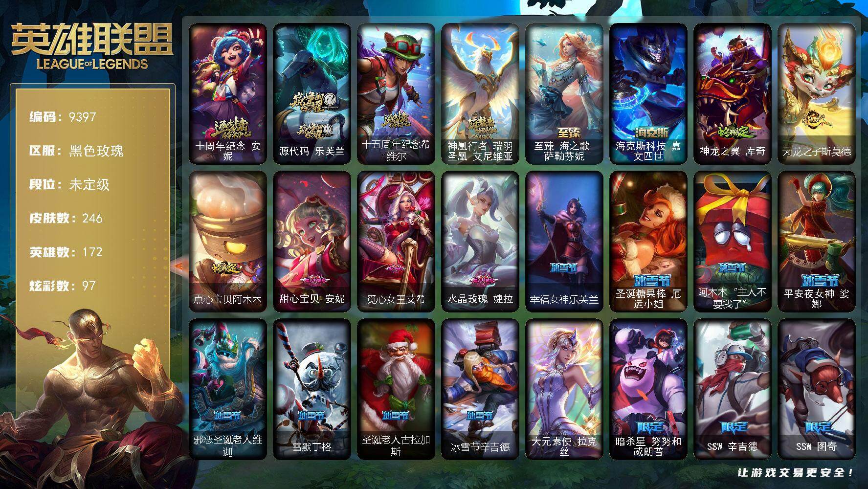 未定级段位-172英雄-246皮肤-97炫彩-1终极-6神话-31限定-22传说-5