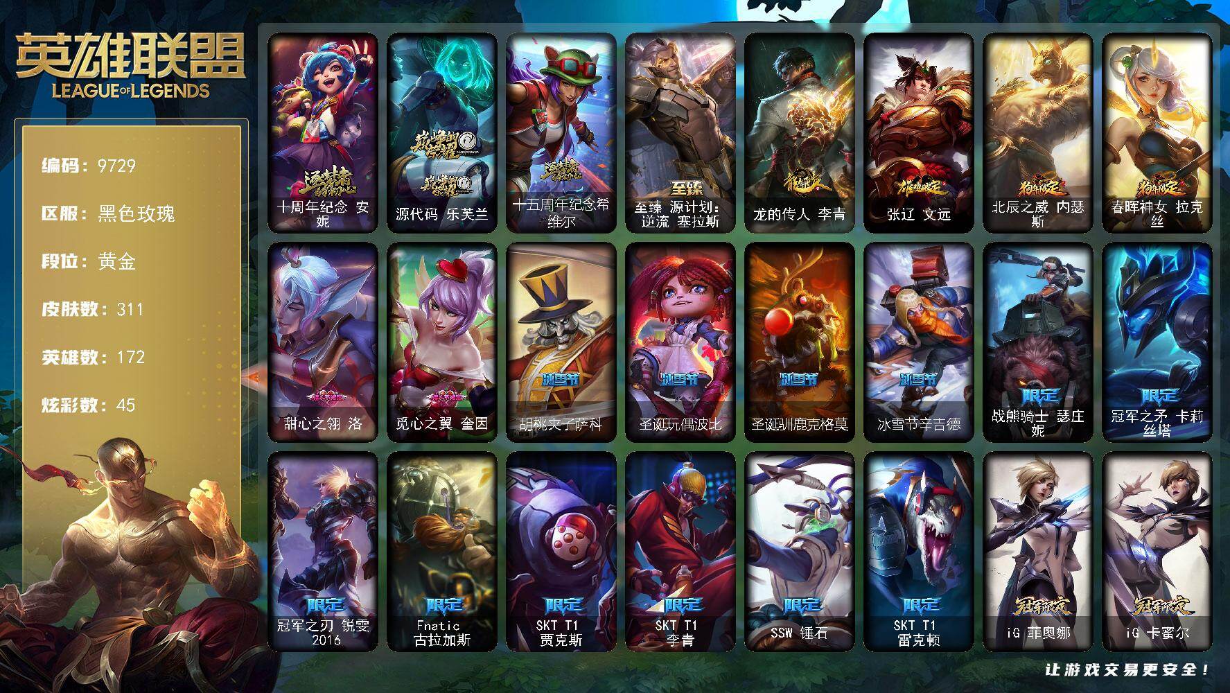 黄金段位-172英雄-311皮肤-45炫彩-0终极-4神话-40限定-32传