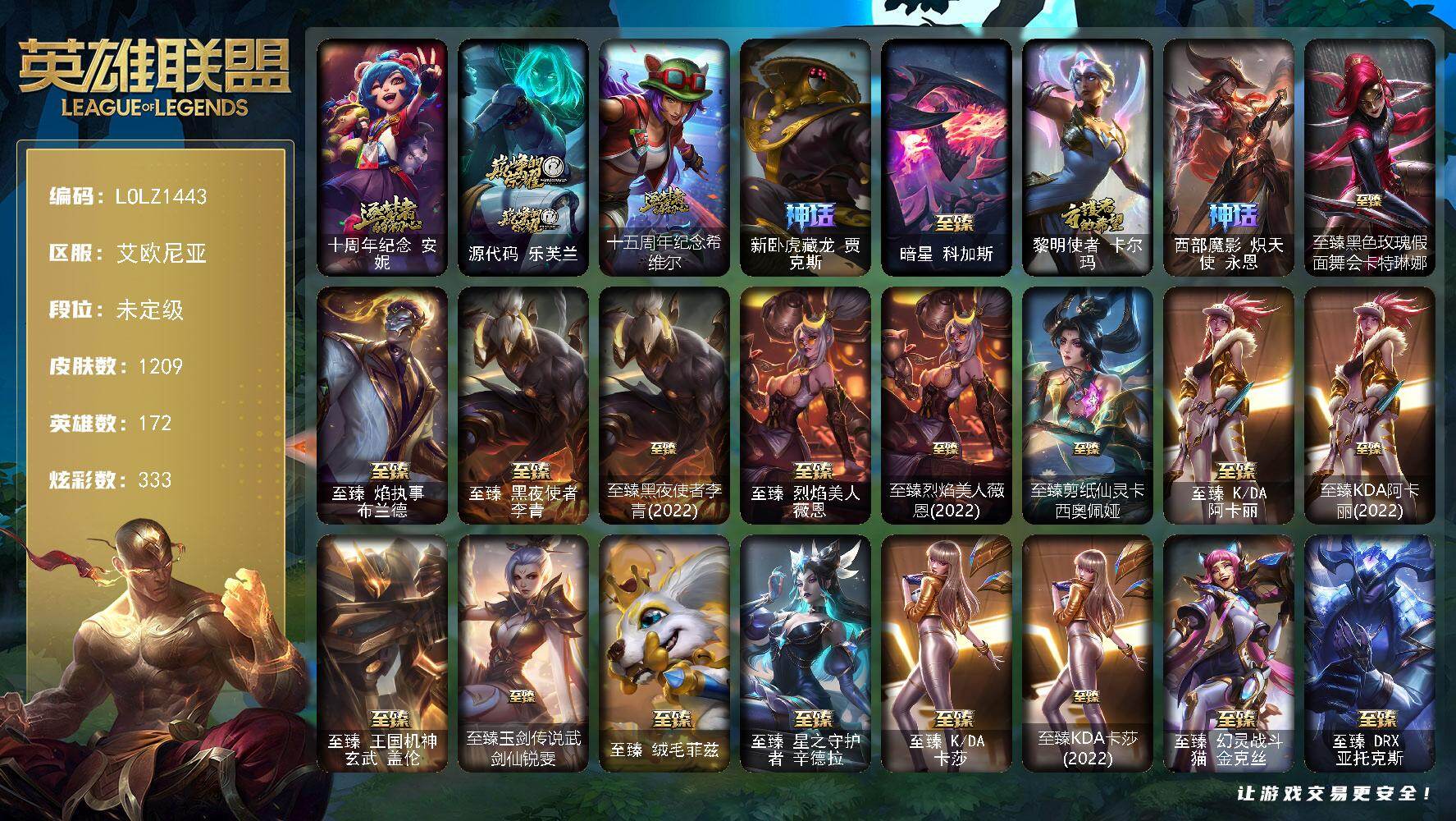 未定级段位-172英雄-1209皮肤-333炫彩-8终极-34神话-257限定-116传说-214史诗