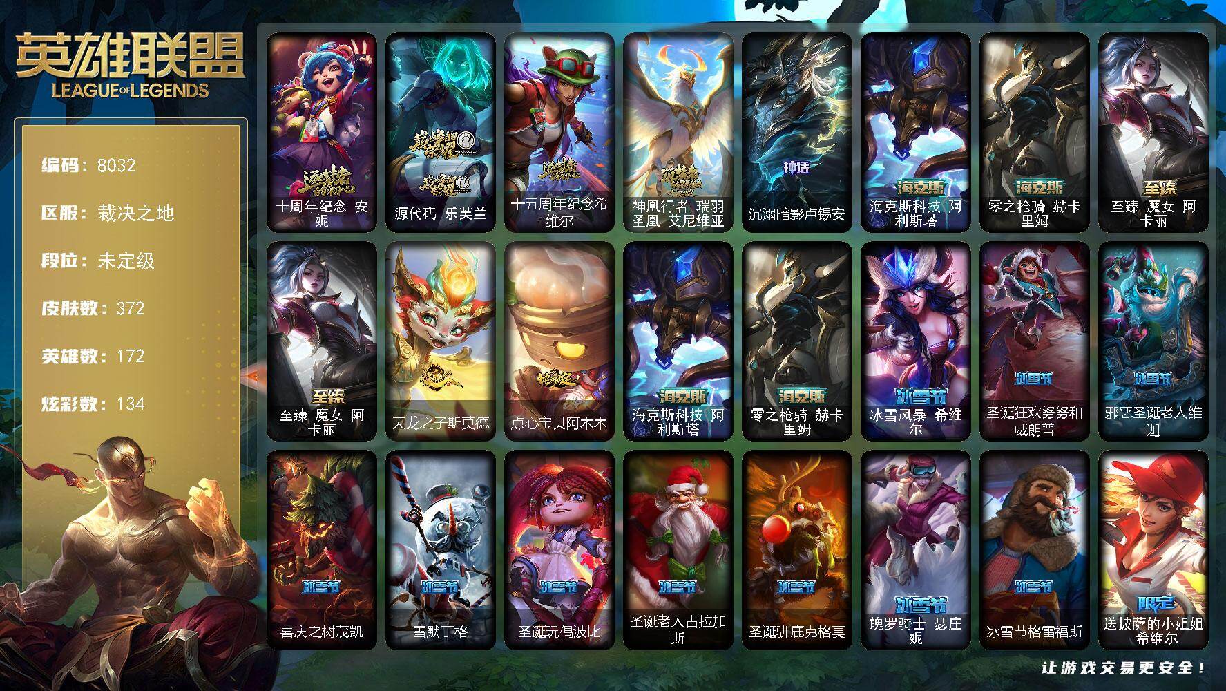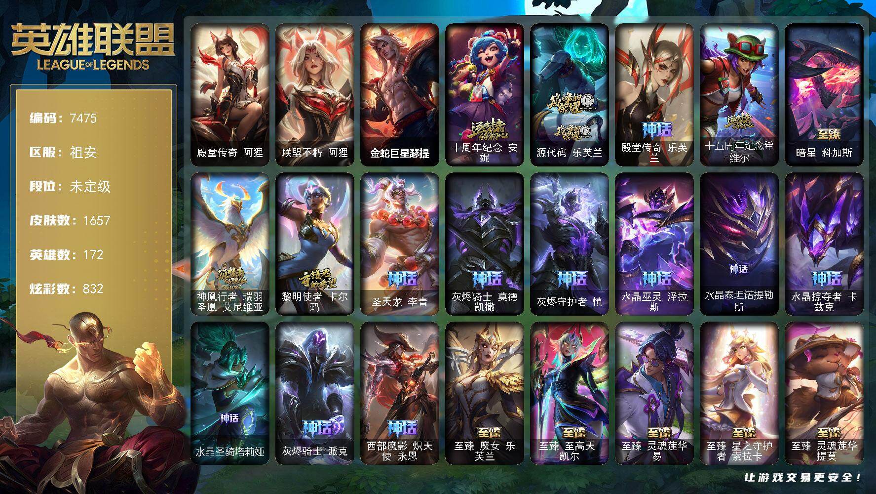 172英雄/305皮肤/5神话/56限定/7臻彩/47炫彩/32传说/59史诗/钻石/十周年纪念安妮/