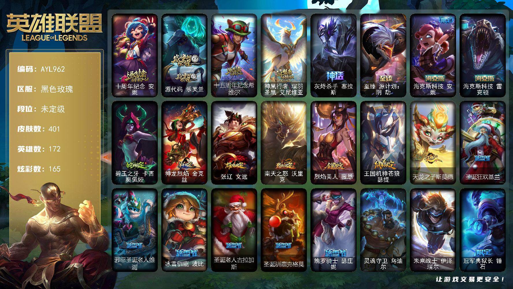 未定级段位-172英雄-401皮肤-165炫彩-2终极-8神话-52限定-34传说-99史诗