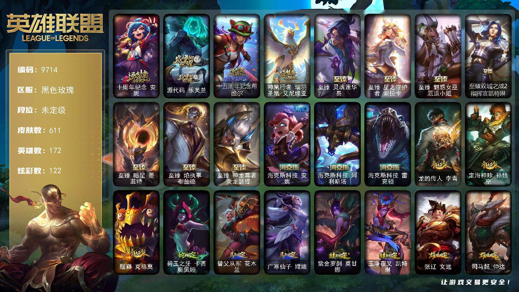 未定级段位-172英雄-611皮肤-122炫彩-4终极-14神话-102限定-48传说-148史诗
