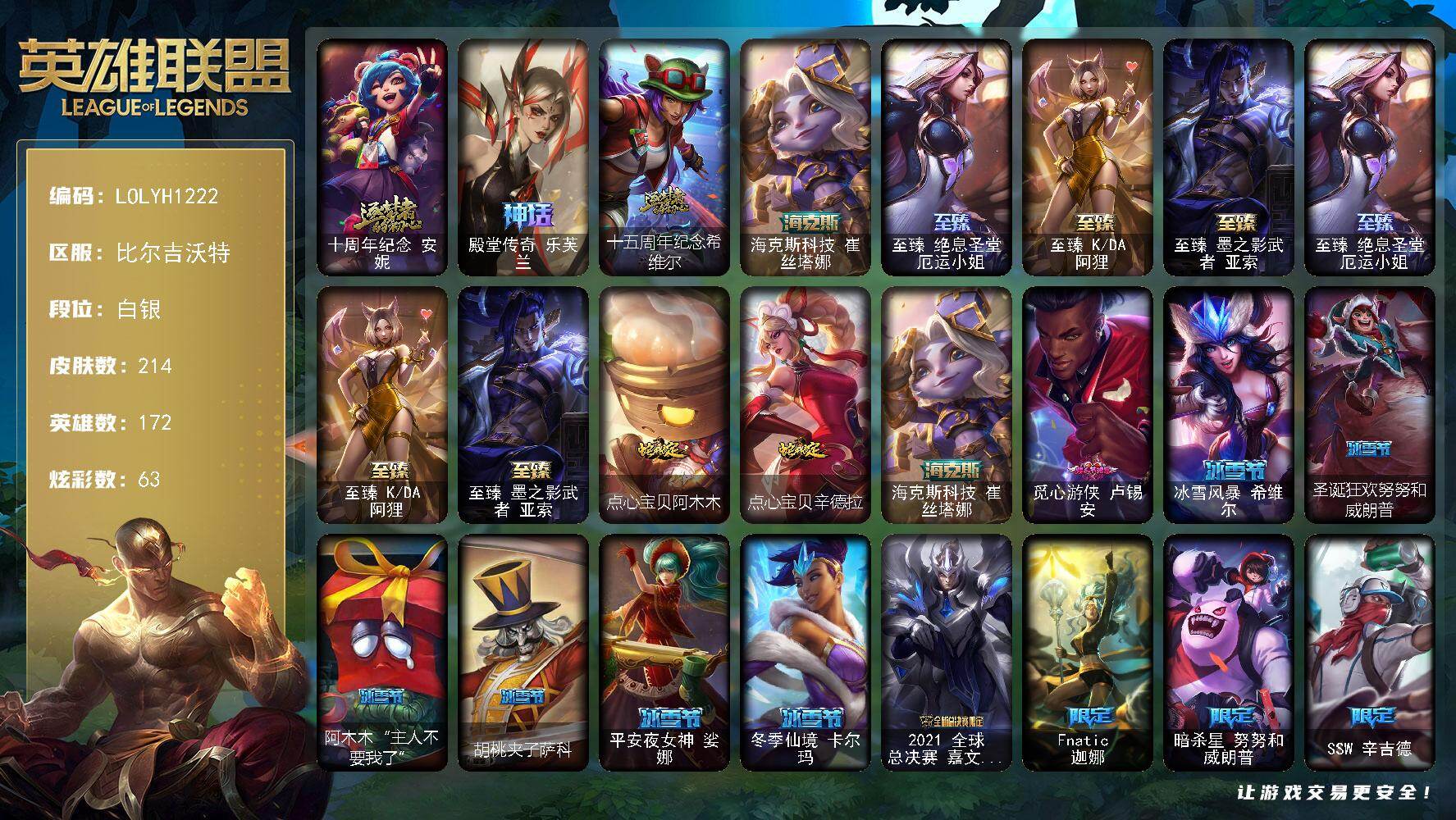 172英雄/214皮肤/7神话/27限定/8臻彩/63炫彩/20传说/40史诗/白银/